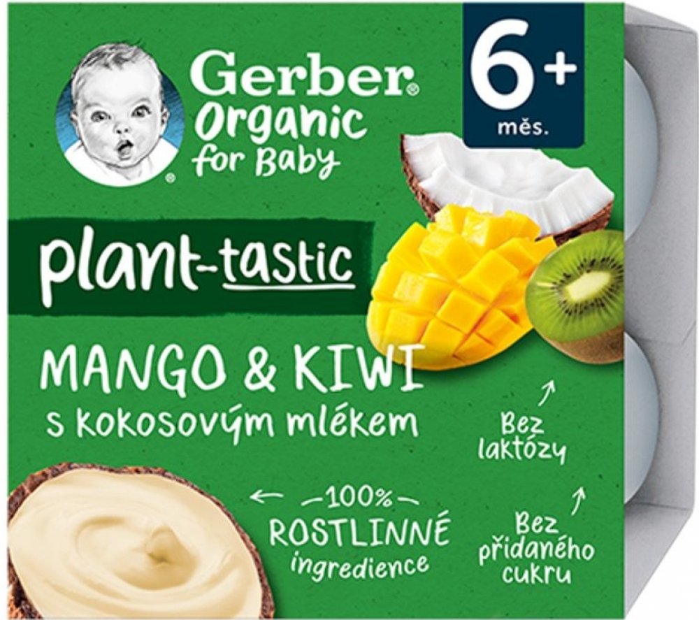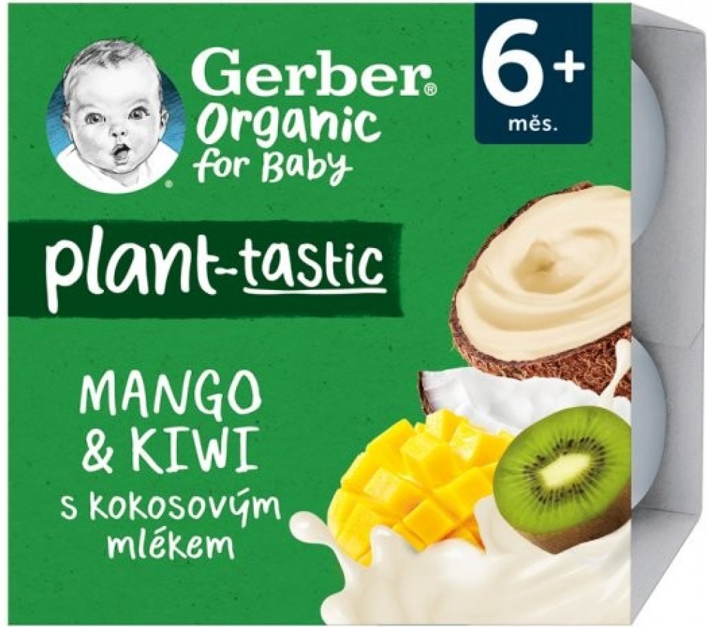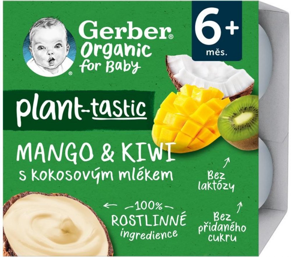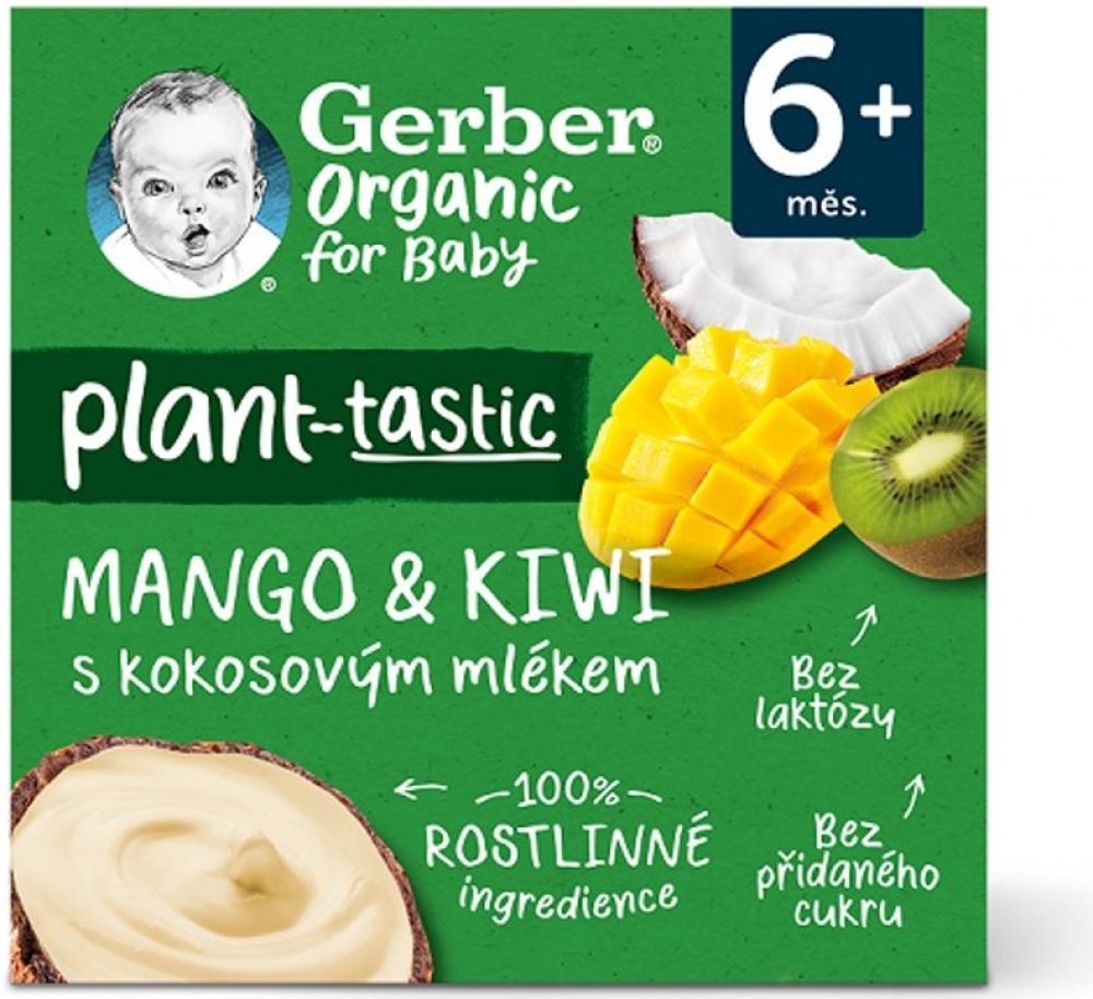 GERBER Organic 100% rostlinný dezert mango a kiwi s kokosovým mlékem. BIO ovocná svačinka. Od ukončeného 6. měsíce. Pasterizované. Baleno v ochranné atmosféře.GERBER Organic 100% rostlinný dezert mango a kiwi s kokosovým mlékem je svačinka, díky které váš malý gurmán může objevovat chutě exotického ovoce. Složení čistě z rostlinných ingrediencí představuje chutnou a rychlou svačinu kdykoliv během ...