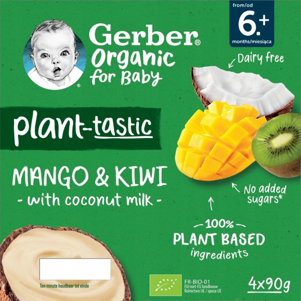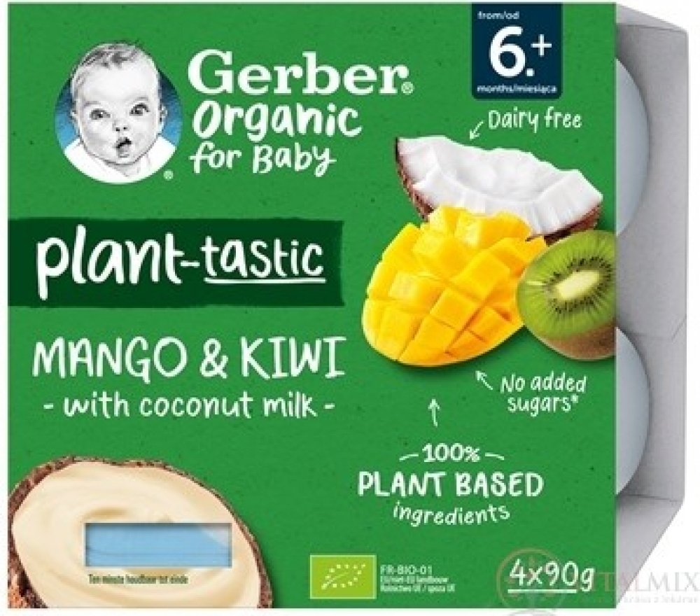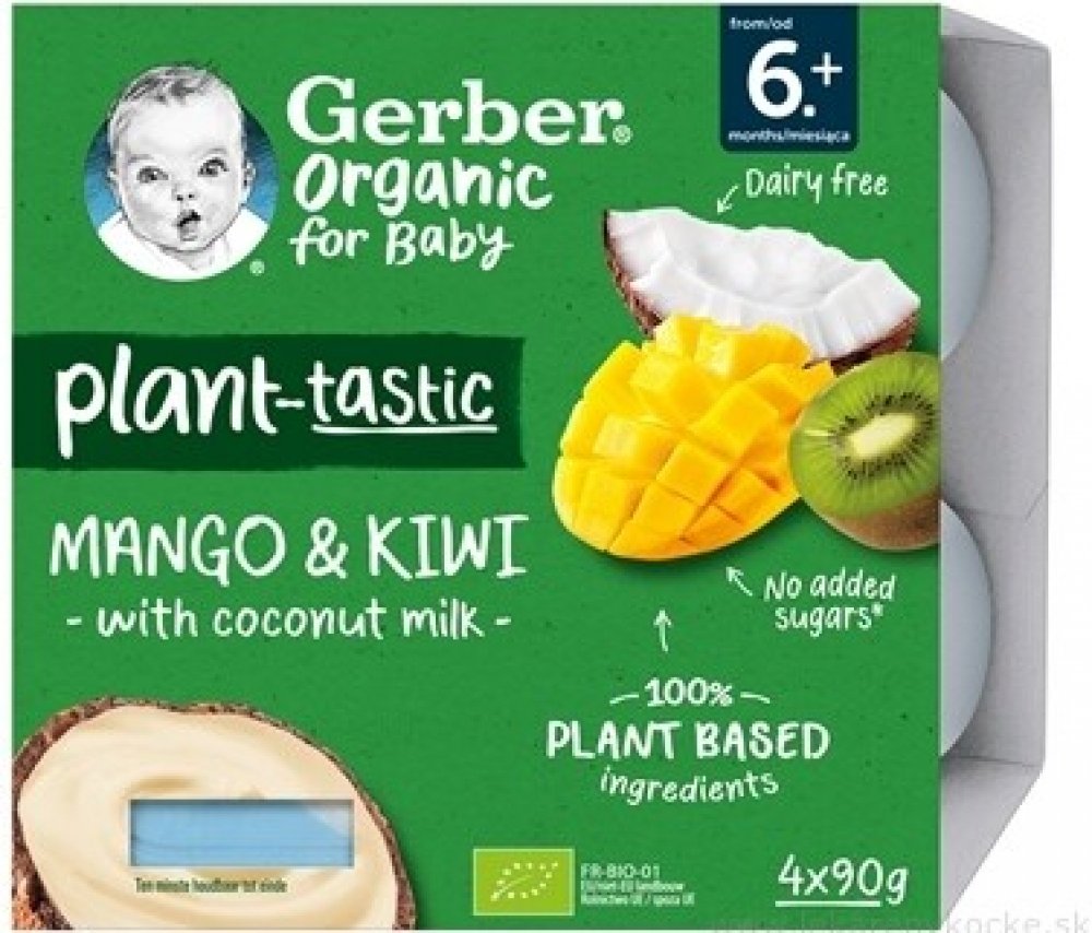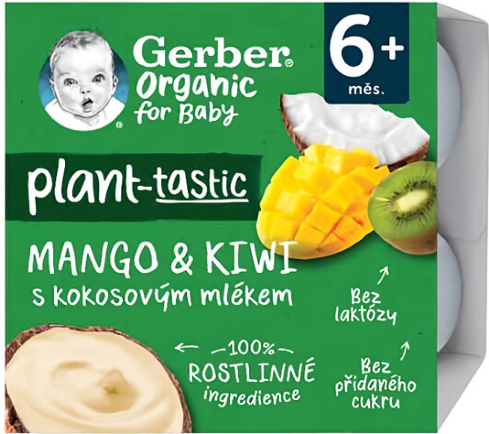 GERBER Organic 100% rostlinný dezert mango a kiwi s kokosovým mlékem. BIO ovocná svačinka. Od ukončeného 6. měsíce. Pasterizované. Baleno v ochranné atmosféře.GERBER Organic 100% rostlinný dezert mango a kiwi s kokosovým mlékem je svačinka, díky které váš malý gurmán může objevovat chutě exotického ovoce. Složení čistě z rostlinných ingrediencí představuje chutnou a rychlou svačinu kdykoliv během ...