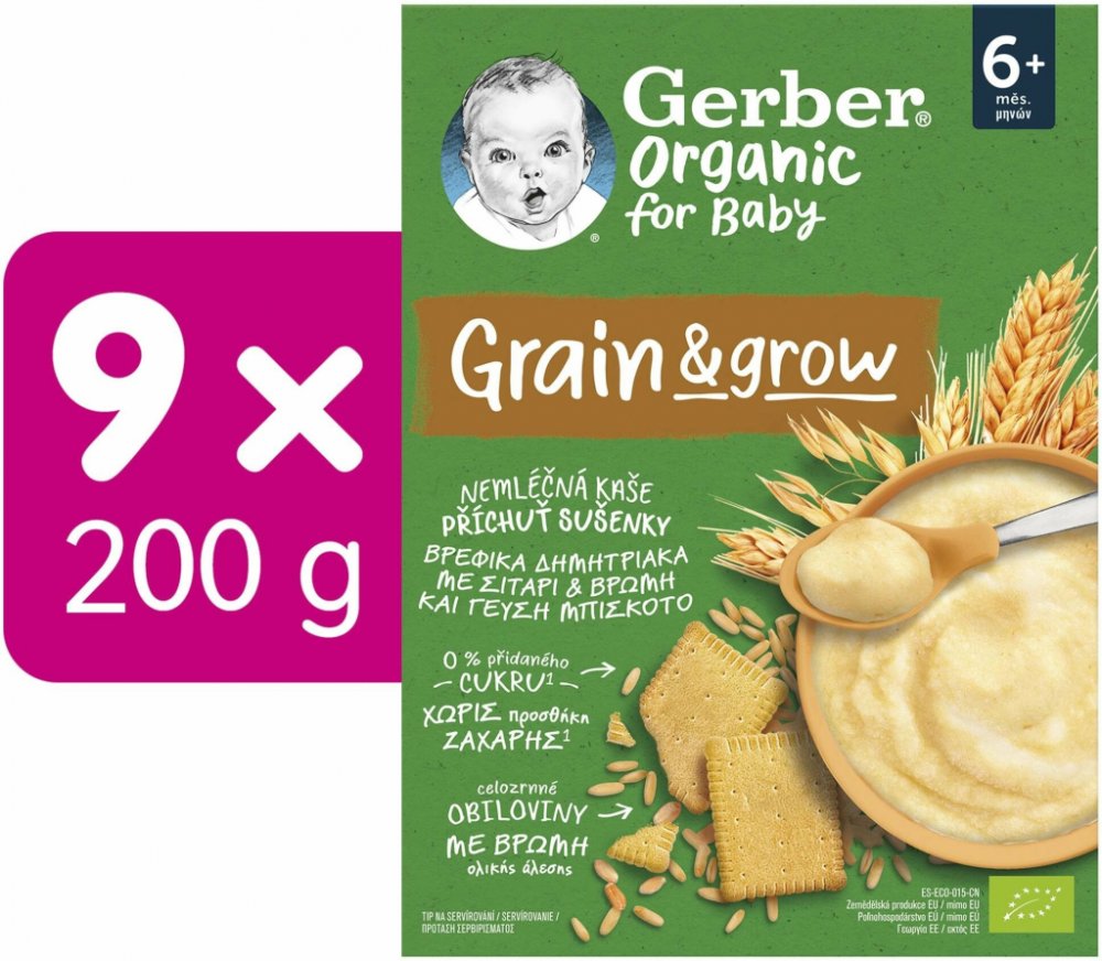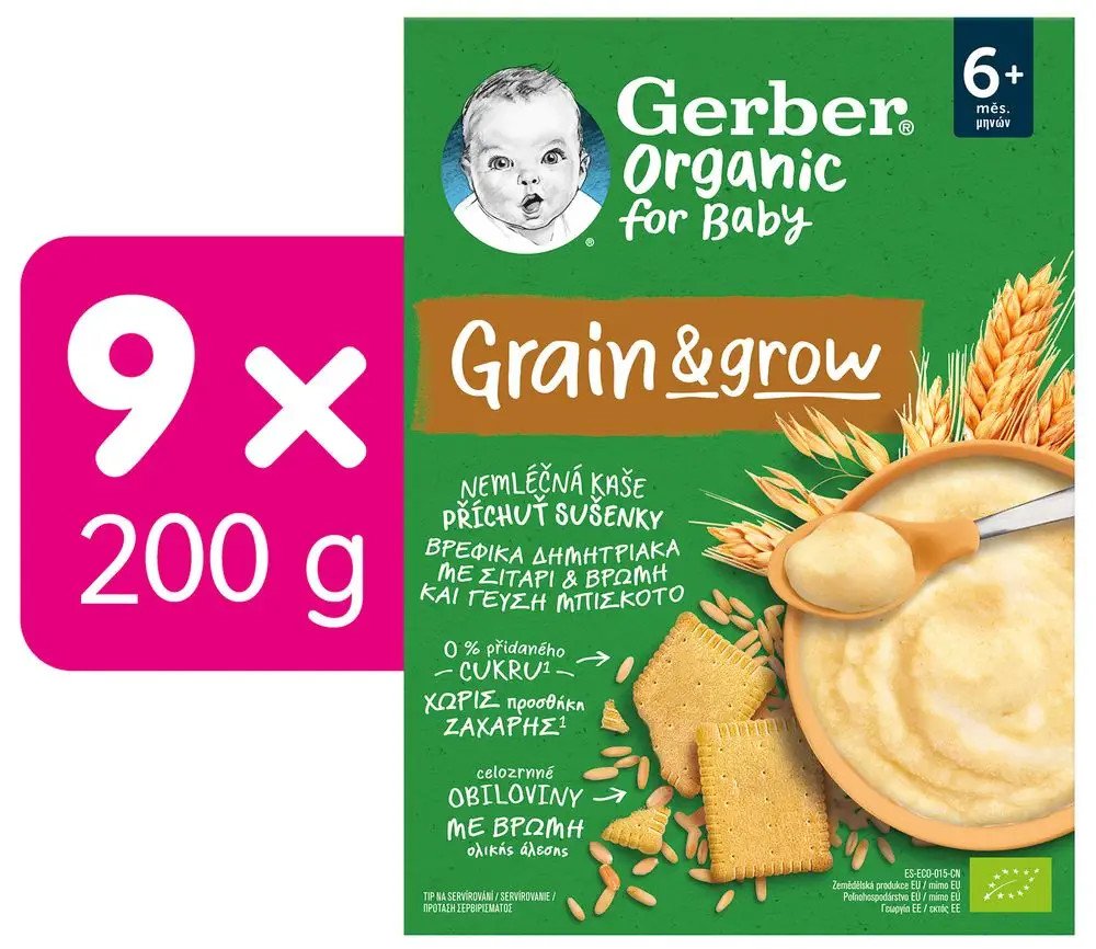 - Gerbee Organic nemléčná kaše s příchutí sušenky v balení 9× 200 g