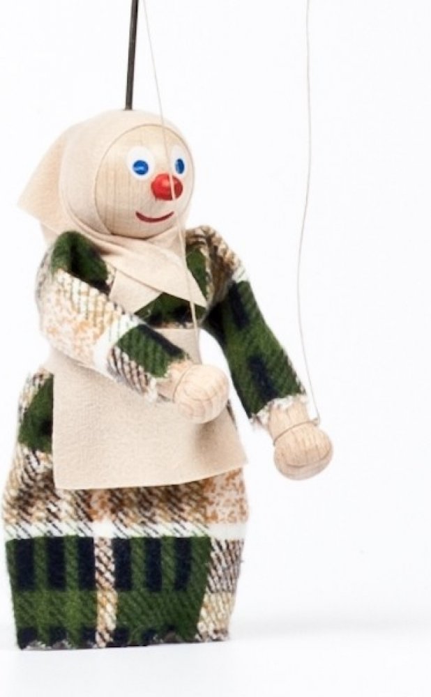 Dřevěná loutka babičky ke knižnímu loutkovému divadlu. Velikost loutky s vodícím drátem 21 cm. Loutka má fialové tělíčko a ručně malovaný obličej. Každá loutka je originál. Loutku využijete např. v pohádce O Červené karkulce, může si však zahrát i Jezinku ve Smolíčkovi. Dřevěná loutka bez vodících nití je vhodná pro nejmenší děti. Nechte je objevovat svět fantazie a loutkových divadel. Česká společnost byla založena v roce 1999 s hlavním záměrem opatřovat zaměstnání lidem se zdravotními problémy, se změněnou pracovní schopností a částečným invalidům. Tito lidé v regionu severní Moravy, postiženém vysokou nezaměstnaností, mají jen velmi malou naději najít si práci. Tento záměr se podařilo naplnit a dnes chráněná dílna GERLICH ODRY s. r. o. zaměstnává okolo 35 pracovníků, z toho 75% lidí právě se zdravotními problémy. Firma vyrábí dřevěné kostky, originální loutková divadla a další.