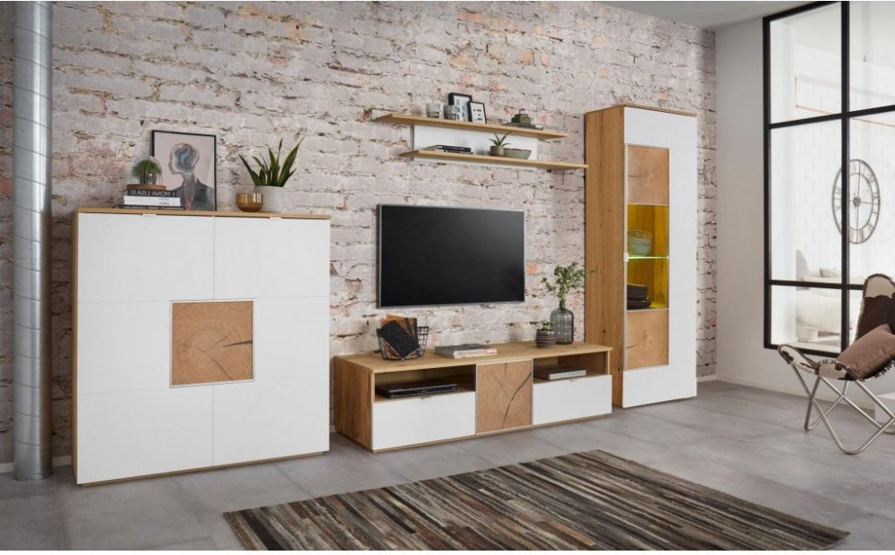 Obývací stěna je součástí kompletního programu Parma - Dub masiv/bílá matná. K této sestavě doporučujeme konferenční stolek Bonn o míře 105x65 cm.