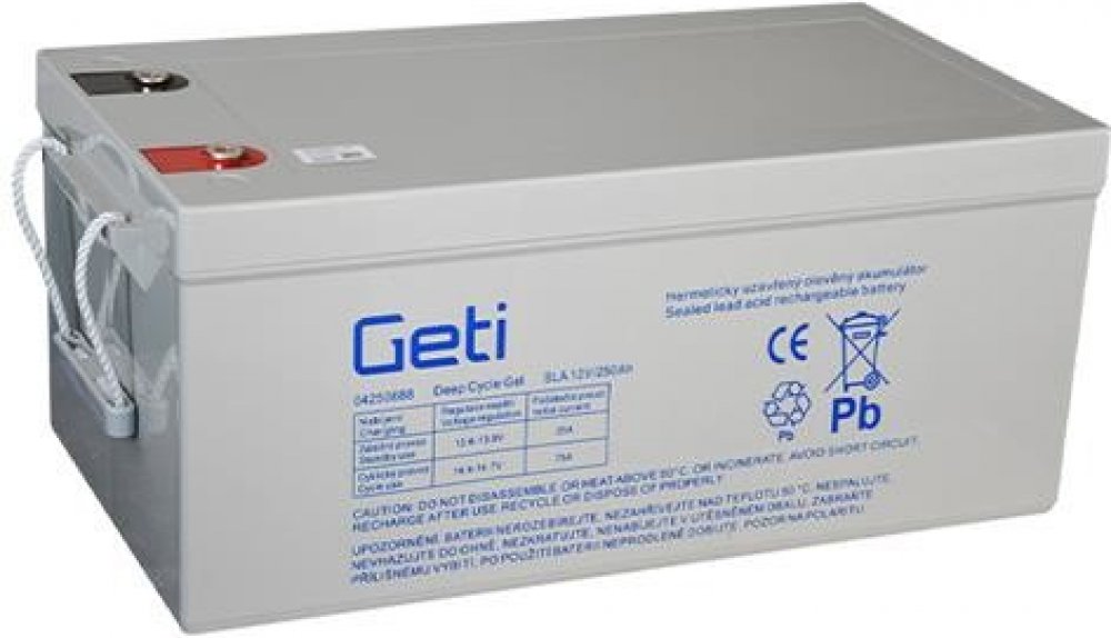 Gelový typ olověného Deep cycle akumulátoru Geti je vhodný zejména do solárních a větrných energetických systémů a karavanů, ale i jako náhrada za baterie pro záložní systémy UPS, záložní zdroje, aplikace EZS, EPS, telekomunikace, výstražná mobilní a signalizační zařízení apod. Jedná se o bezúdržbový, hermeticky uzavřený akumulátor, což umožňuje libovolnou pracovní polohu.Technické parametry:- technologie výroby: VRLA (valve regulated lead acid) - ventilem řízené olověné akumulátory- typ: GEL- napětí: 12 V- kapacita: 250 Ah (25°C)- počet cyklů: ≥500 Cycles @25℃ ( DoD 80% )- počet cyklů: ≥900 Cycles @25℃ ( DoD 50% )- vybíjecí proud špičkový: 2000A (5s) při 25°C- vybíjecí proud doporučený: 25,50A- nabíjecí proud pro pohotovostní režim: 50A max. (0,2C)- nabíjecí proud pro cyklický režim: 75A max. (0,3C)- nabíjecí napětí pro pohotovostní režim: 2,25 - 2,30 V / článek při 25°C- nabíjecí napětí pro cyklický režim: 2,40 - 2,45 V / článek při 25°C- nabíjecí metoda: CV- úroveň samovybíjení: méně než 3% / měs. při 25°C- vnitřní odpor (plně nabitá baterie): 3 mΩ- připojovací konektory: T13- teplota nabíjení: -20℃~50℃- teplota vybíjení: -40℃~60℃- teplota skladovací: -20℃~60℃- rozměry: 520 x 268 x 220 mm- celková výška (s koncovkami): 223 mm- hmotnost: cca 69.0 Kg