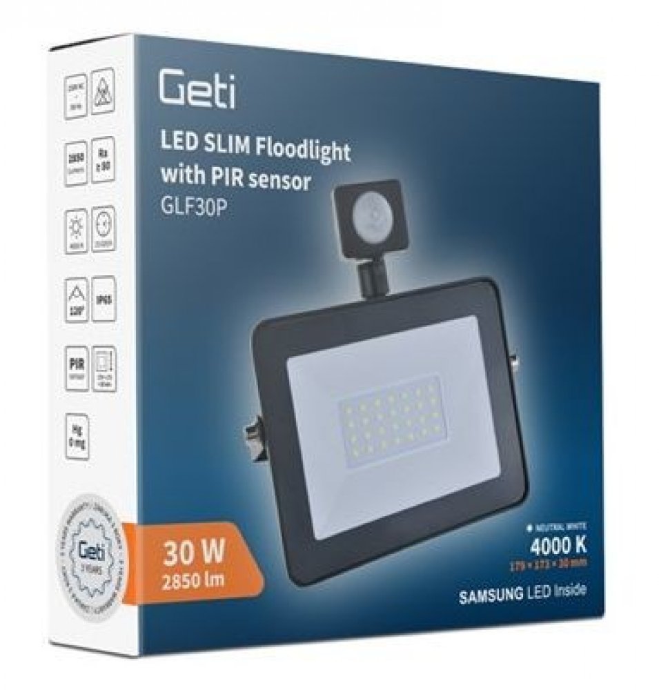 LED reflektor Geti GLF30P je plnohodnotnou náhradou halogenových reflektorů s úsporou až 70% energie. Po zapnutí svítí okamžitě v plné intenzitě. Je osazen výkonnými SAMSUNG diodami a proto dosahuje vysoké svítivosti. Jedná se o provedení SLIM což znamená, že reflektor je menší, tenčí a lehčí, díky čemuž je možné ho umístit téměř kamkoli. U reflektoru lze libovolně nastavit jeho polohu díky polohovatelnému držáku, který v sobě má již díry pro uchycení. LED reflektor je v celokovovém provedení s bezpečnostním sklem, je odolný proti dešti a vlhkému prostředí, proto najde uplatnění jak pro vnitřní tak i venkovní použití. Reflektor je vybaven PIR čidlem pro spínání na základě detekce pohybu.