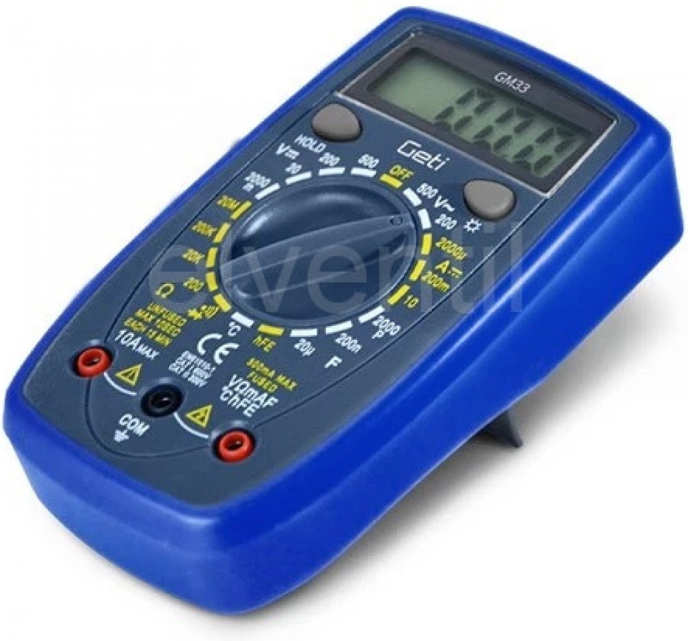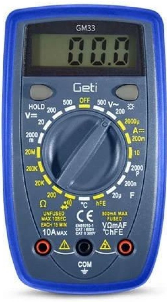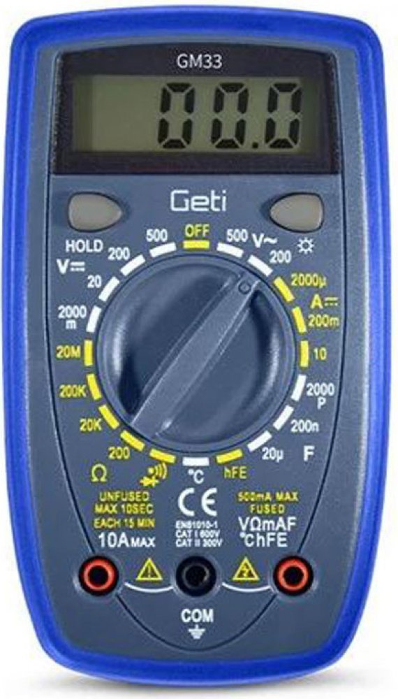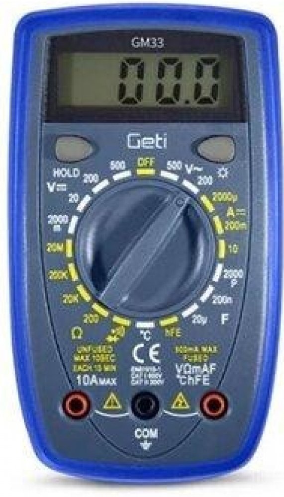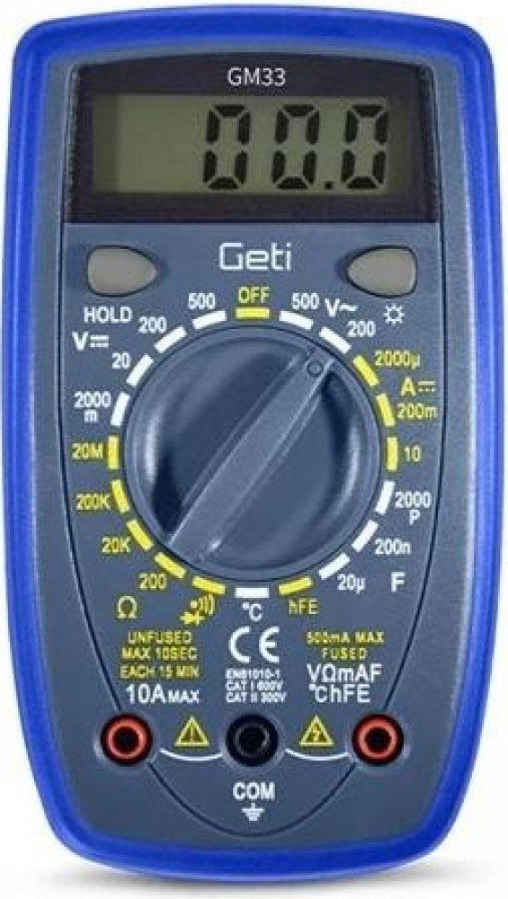 Multimetr GETI GM33A nalezne své uplatnění při měření široké škály elektrických veličin jako jsou například: napětí (DCV a ACV), proud (DCA), odpor, kapacita a mnoho dalších. Přehledný displej doplněný o podsvícení, zajišťuje snadnou a přesnou čitelnost naměřených hodnot i za horších světelných podmínek. Přístroj je také vybaven dalšími praktickými funkcemi, jako je indikace slabé baterie, ochrana proti přetížení, testování diod, měření kontinuity nebo testování tranzistorů, které dodávají multimetru uživatelsky přívětivý charakter, který díky kompaktním rozměrům a nízké hmotnosti zaručuje snadnou manipulaci i v těžko přístupných místech. Všechny tyto vlastnosti z tohoto přístroje činí všestranného pomocníka, nejen v dílnách, ale i domácnostech.