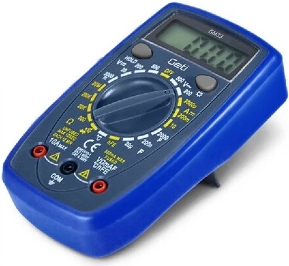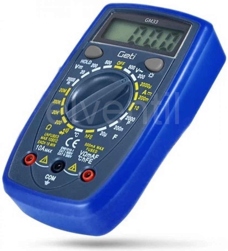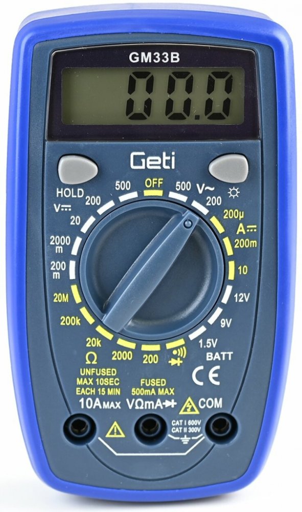 Multimetr GETI GM33B nalezne své uplatnění při měření široké škály elektrických veličin jako jsou například: napětí (DCV a ACV), proud (DCA), odpor, kapacita a mnoho dalších. Přehledný displej doplněný o podsvícení, zajišťuje snadnou a přesnou čitelnost naměřených hodnot i za horších světelných podmínek. Přístroj je také vybaven dalšími praktickými funkcemi, jako je indikace slabé baterie, ochrana proti přetížení, testování diod, měření kontinuity nebo testování tranzistorů, které dodávají multimetru uživatelsky přívětivý charakter, který díky kompaktním rozměrům a nízké hmotnosti zaručuje snadnou manipulaci i v těžko přístupných místech. Všechny tyto vlastnosti z tohoto přístroje činí všestranného pomocníka, nejen v dílnách, ale i domácnostech.