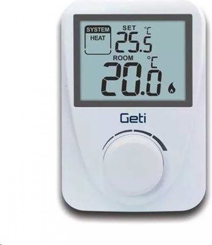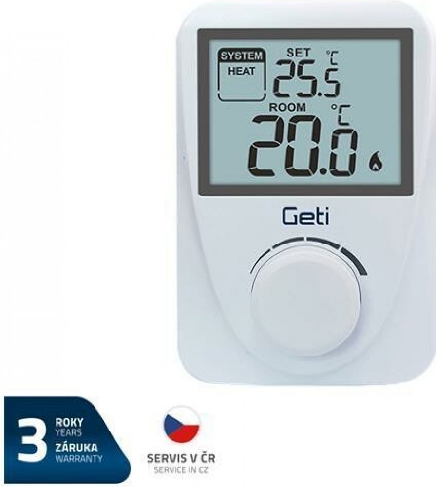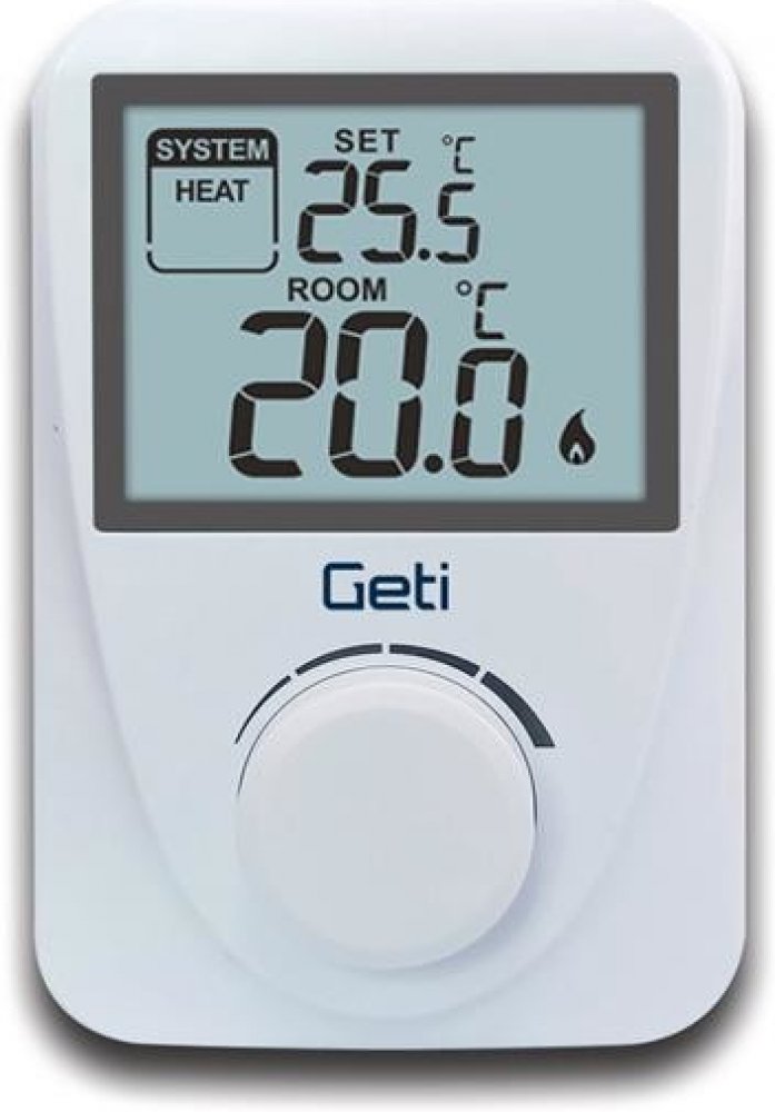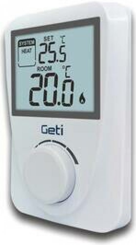 Jednoduchý pokojový drátový termostat GETI GRT01 hlídá ideální teplotu a reguluje topicí systém nebo klimatizaci ve dne i v noci. Výhodou je jednoduché ovládání a podsvícený displej s velkými číslicemi a informacemi o aktuální požadované teplotě. Termostat disponuje ochranou proti zamrznutí, dí