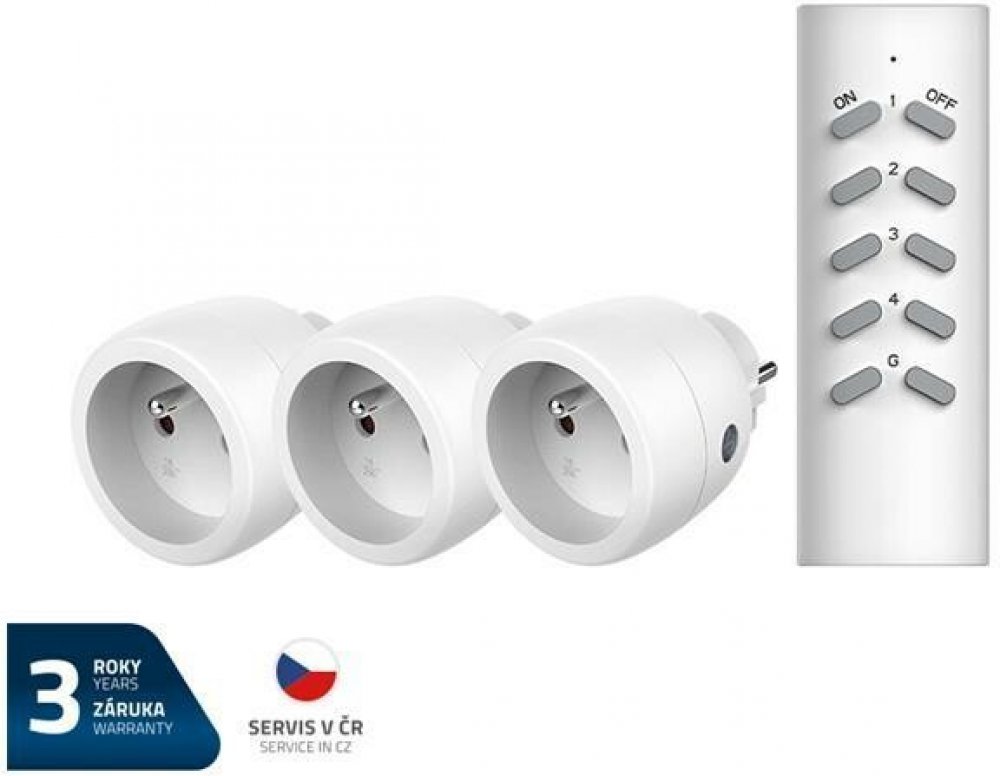 Na tento výrobek poskytujeme 3 roky záruku. Sestava bezdrátově ovládaných zásuvek GETI RCS312 obsahuje dálkový ovladač a 3x zásuvky 230V s přijímačem. Je určena pro dálkové zapínání a vypínání elektrických spotřebičů jako jsou světla, televizory, počítače, vánoční osvětlení a podobně. Zejména v místech, kde není snadný přístup např. za skříněmi, je toto řešení ideální. Pomocí dálkového ovladače můžete zapínat a vypínat elektrická zařízení přes nábytek i zdi. Pamatujte na to, že přes různé překážky se dosah zařízení snižuje. Maximální připojená zátěž je 3680 W/16 A. Zásuvky lze ovládat také ručně tlačítkem. LEARNING CODE - automatické nastavení přenosové frekvence umožňuje spárování až 4 zásuvky k dálkovému ovladači Parametry produktu: - možnost ručního zapnutí a vypnutí - dětská pojistka, LED indikace - dosah signálu ve volném prostoru: 30m - zásuvka rozpíná fázový vodič Technické parametry: - napájení zásuvky: 220-240 V AC, 50 Hz - max. 3680W, AC 230V/16A - přenosová frekvence: 433,92 MHz - napájení dálkového ovladače: 1 x baterie CR2032 - krytí: IP20 - obsah balení: 3 zásuvky, 1 dálkový ovladač - prodejní obal: 1 ks, krabička/ 40 ks, karton