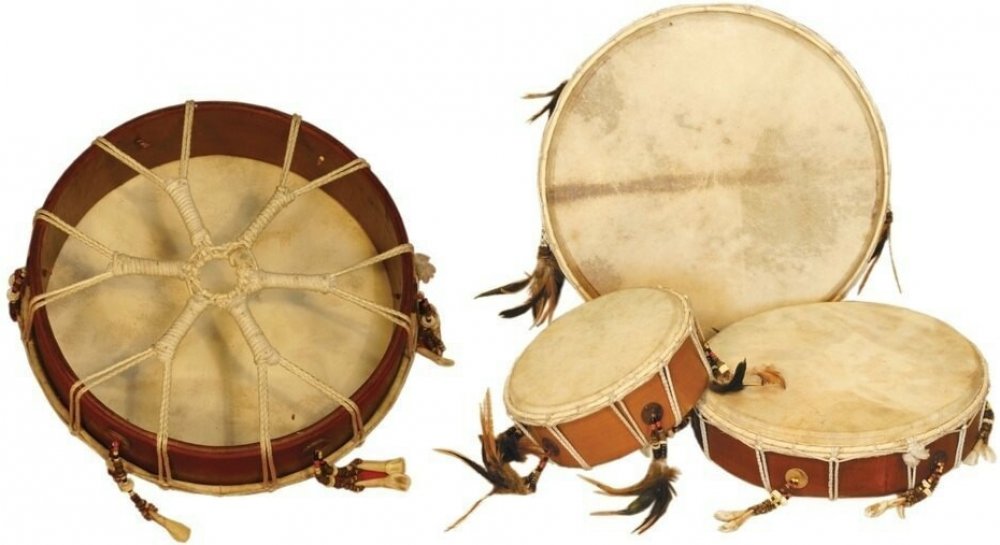 Šamanský buben s dřevěným rámem, bez paliček, s napínacími provázky, průměr 38 cm.