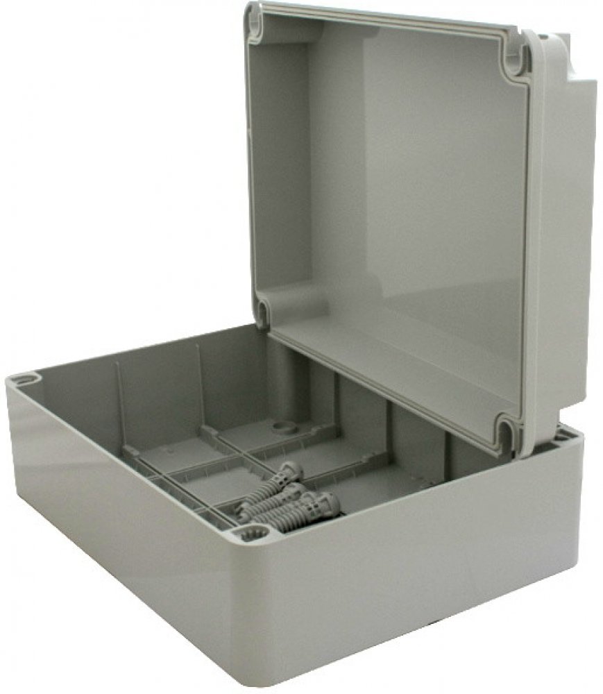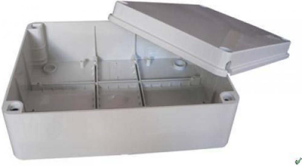 Jedná se o bezhalogenovou vodotěsnou montážní krabici s označením Gewiss GW44209 a montáží na zeď. Vnitřní rozměry jsou 300 x 220 x 120 mm, stupeň krytí IP56.