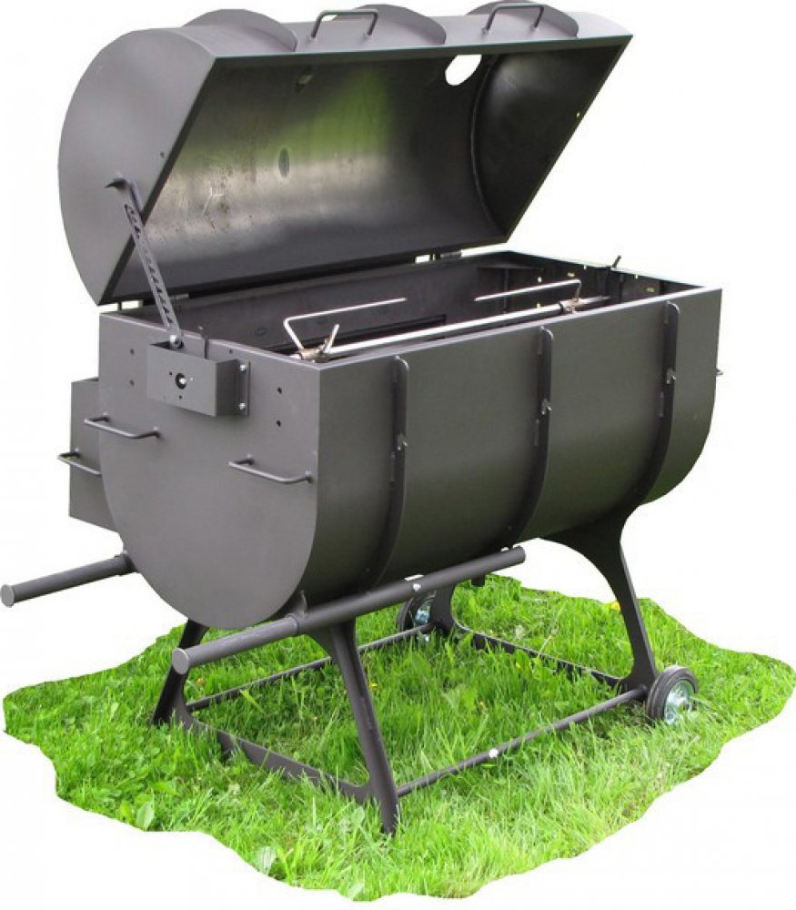 Profi celokovový gril určený pro grilování selat, menších prasat cca do 30-35 kg, kýty, jehňat a různých druhů masa na nerezové grilovací jehle. Teoretickým maximem zatížení jehly pro grilování je "krátké sele" do hmotnosti 50 Kg. Úspora paliva až 40% oproti otevřeným grilům. Palivo: dřevo a dřevěné uhlíPoužité materiály: * nosná konstrukce, vana grilu, topeniště grilu - černá ocel, ocelový plech, palivový rošt - ocelový plech* jehla (rožeň), bodce - nerezPoužití: pouze pro venkovní použití, není vhodné pro stálou venkovní instalaciBarva 2014: černá, žáruvzdorná do 500-700°C, lesklá (vnitřek grilu - bez povrchové úpravy). Při vyšších teplotách se může barva na exponovaných místech (např. kolem topeniště) sloupávat. Lze znovu snadno obnovit novým nátěrem.