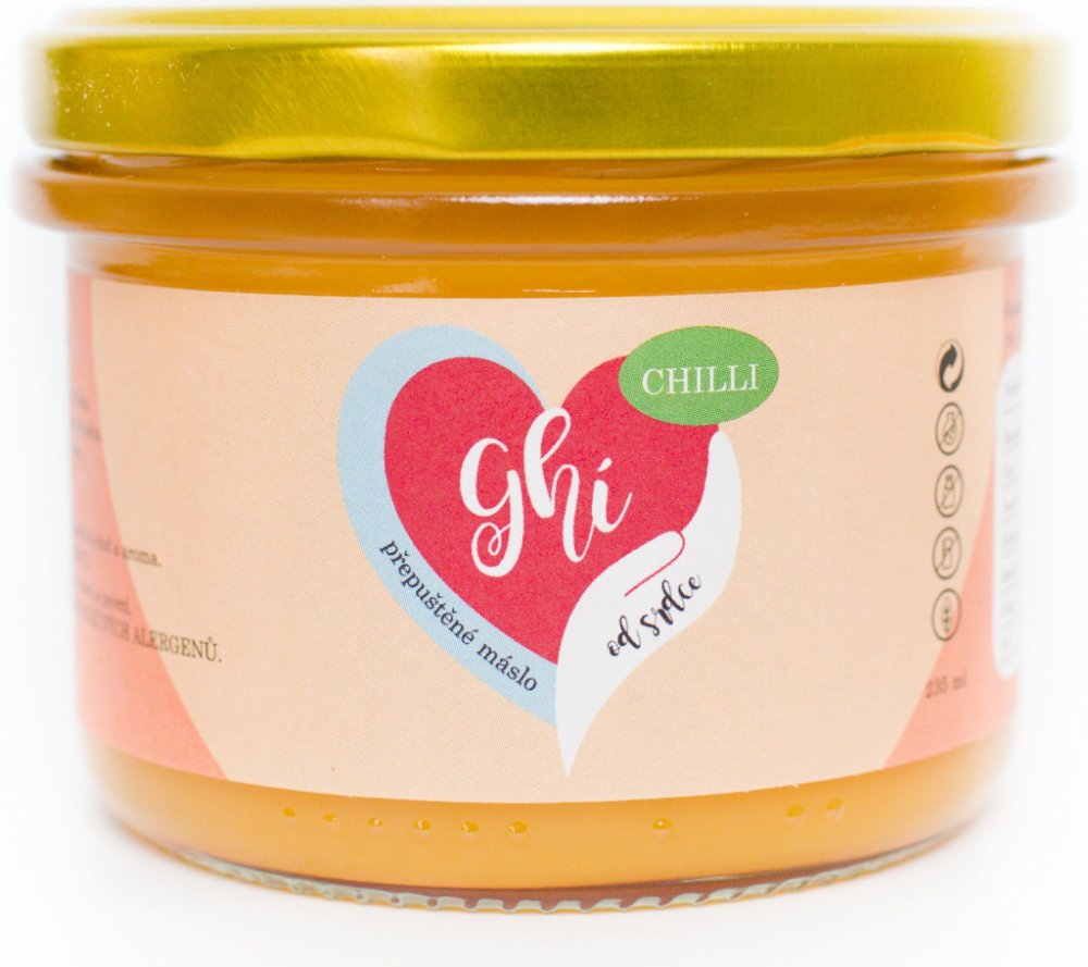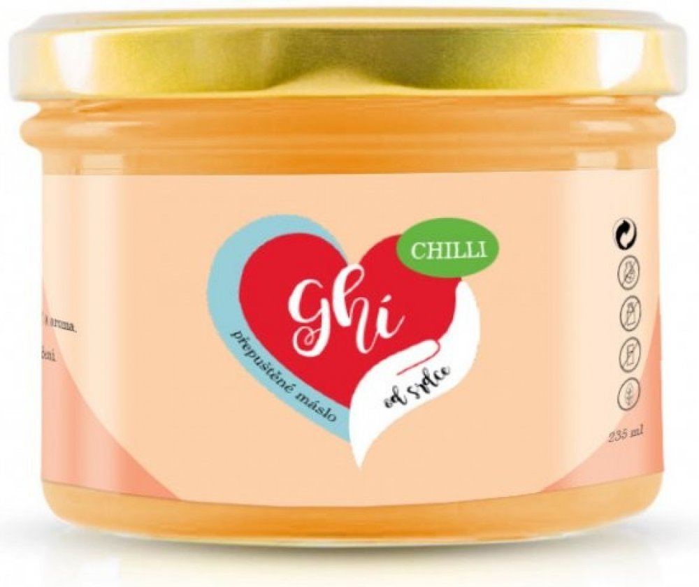Ochucené ghí Ghí od Srdce "Chilli"235 ml Ochucené ghí Ghí od Srdce "Chilli" představuje přepuštěné máslo, které si mohou dopřát i osoby s intolerancí na laktózu. Tvořeno je z 99 % máselným tukem zbaveným mléčné bílkoviny a doplněno o chilli. Ochucené ghí Ghí od Srdce "Chilli" je vyrobeno ručně a nabízí vysoký kouřový bod až 250 °C. Použít ho můžete na smažení, pečení i vaření nebo si ho namazat n...