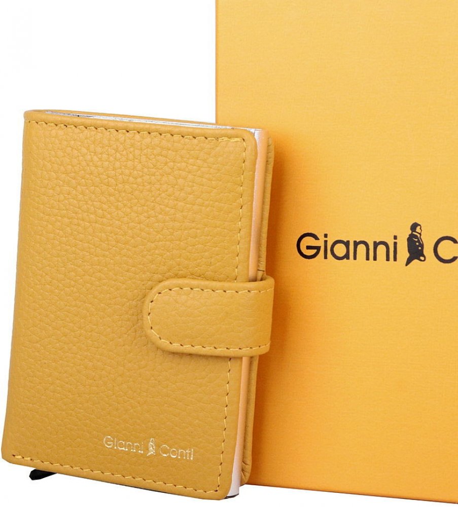 Značkové moderní pouzdro na karty či doklady v krásné žluté barvě Gianni Conti s logem značky na přední straně. Pouzdro se uzavírá na upínku na druk.
