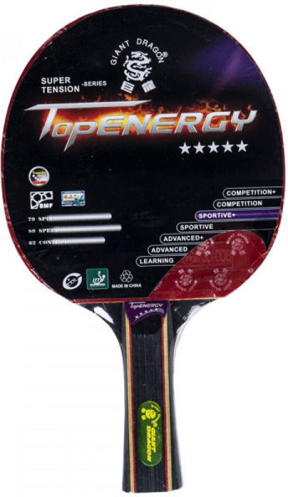 Je pálka od značkového výrobce GIANT DRAGON je vyrobena z kvalitních materiálů za použití nejmodernějších technologií. Je vyrobena z pětivrstvé odlehčené překližky a značkového potahu scháleného ITTF TOPENERGY. Je určena pro pokročilejší hráče, kteří využijí kvalitu potahu 1,8 mm. Technický popis: