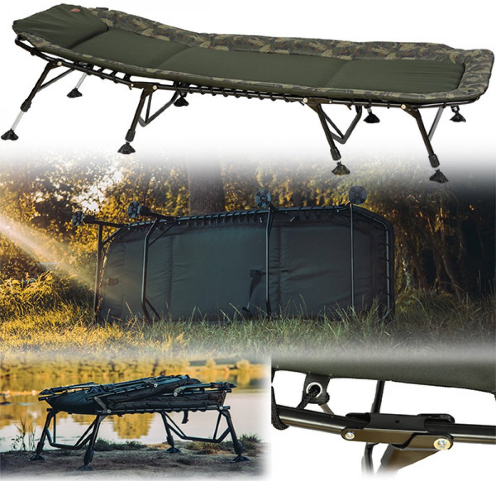 Rybářské lehátko Giants Fishing Gaube XT 8 Leg ve stylovém designu s nosností až do 150kg. Lehátko Gaube XT 8 Leg má zelenou barvu matrace zkombinovanou s camo okrajem. Polstrovaná matrace 8 mi nohého lehátka z ocelové konstrukce o průměru 22 a 25mm. Rybářské lehátko Gaube XT 8 Leg je v hlavové části lehce polstrované. U Giants Fishing rybářského lehátka Gaube XT 8 Leg, lze dle potřeby nastavit tuhost matrace, tu nastavíte pomocí gum na spodní straně lehátka. Díky nastavení tuhosti matrace docílíte maximálního komfortu při spaní v přírodě. Nožičky lehátka Gaube XT 8 Leg jsou zakončeny velkými packami, které zabraňují zaboření do bláta. Nohy rybářského lehátky si nastavíte do požadované výšky, dle potřeby a jednoduše zajistíte.