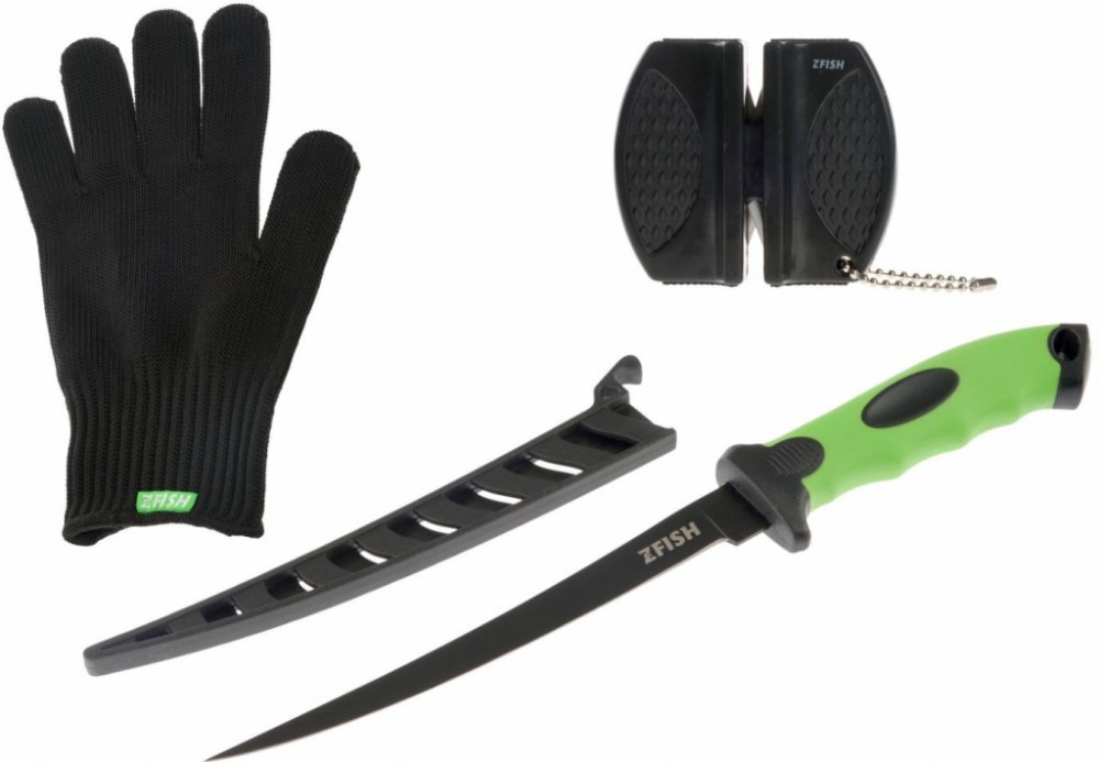 Vysoce kvalitní a ostrý filetovací nůž s pouzdrem, filetovací rukavice a oboustranný brousek.