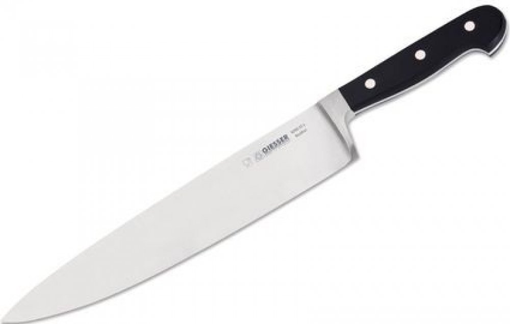 Délka ostří: 25 cmČEPEL nože vyrobena z jednohokusu kované oceli. Obzvláště vysokýobsah uhlíku 0,55-0,59 % prozajištění výjimečně dlouhé životnostiostří a mimořádné ostrosti.ERGONOMICKÝ TVAR rukojeti s lehkýmzaoblením hran. Perfektní přilnavost pro zajištěnípřesného vedení. Z plastu speciálně vyvinutéhopro styk s potravinou. Pevně přidělána třemi nýty. Materiál: nerez/ plastTyp: kovanýDélka: 150,1...
