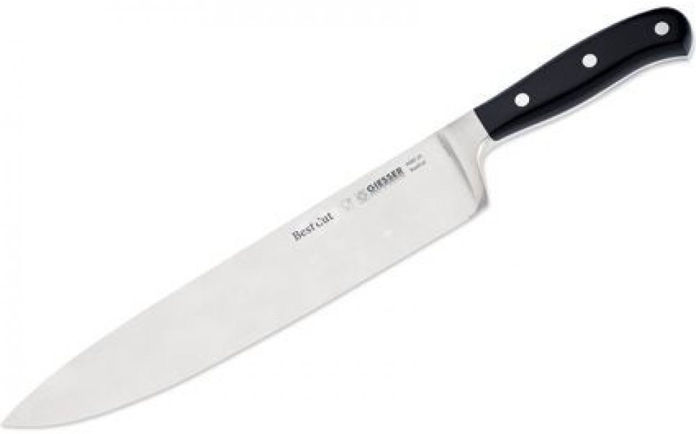Délka ostří: 25 cmČEPEL nože vyrobena z jednohokusu kované oceli. Obzvláště vysokýobsah uhlíku 0,55-0,59 % prozajištění výjimečně dlouhé životnostiostří a mimořádné ostrosti.ERGONOMICKÝ TVAR rukojeti s lehkýmzaoblením hran. Perfektní přilnavost pro zajištěnípřesného vedení. Z plastu speciálně vyvinutéhopro styk s potravinou. Pevně přidělána třemi nýty.Každý nůž ze série BestCut mápřiděleno UNIKÁTN...