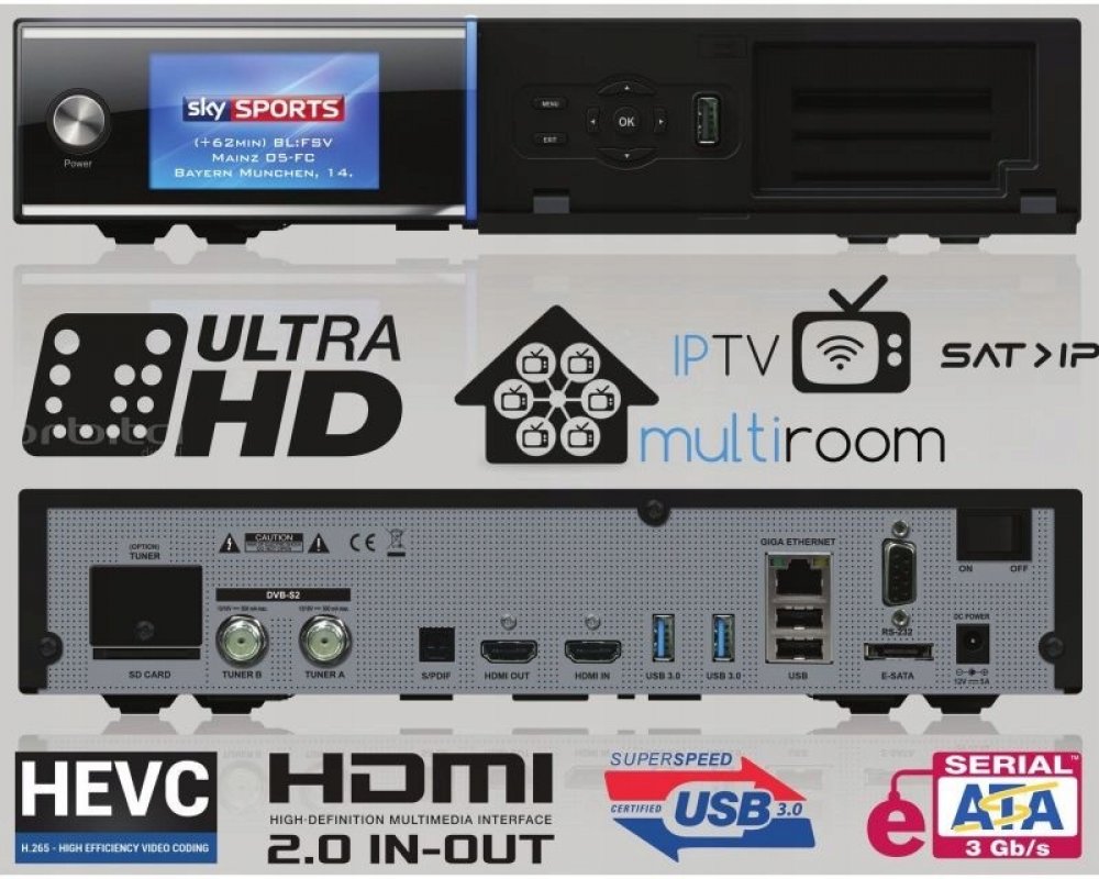 2 vestavěné tunery DVB-S2 umožňují neomezené dvojité použití 8 tunerů (tuner FBC). Další slot pro tuner navíc nabízí možnost rozšířit přijímač o dvojité tunery DVBS2 , DVB-T/T2 nebo DVB-C2. Výkonný procesor nabízí divákovi obrazový materiál ve vysokém rozlišení 4k a dosud nevídaně rychlé přepínání.