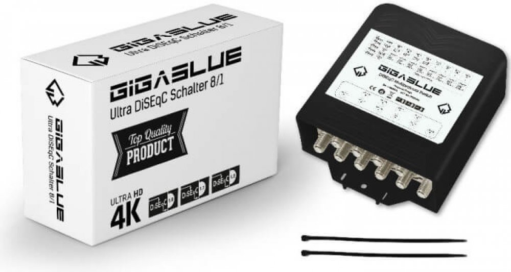 Přepínač vysoké kvality GigaBlue Ultra DiSEqC 8/1 s pevným pouzdrem, odolným proti povětrnostním vlivům. Slouží pro propojení 8 LNB s ochranou před povětrnostními podmínkami.