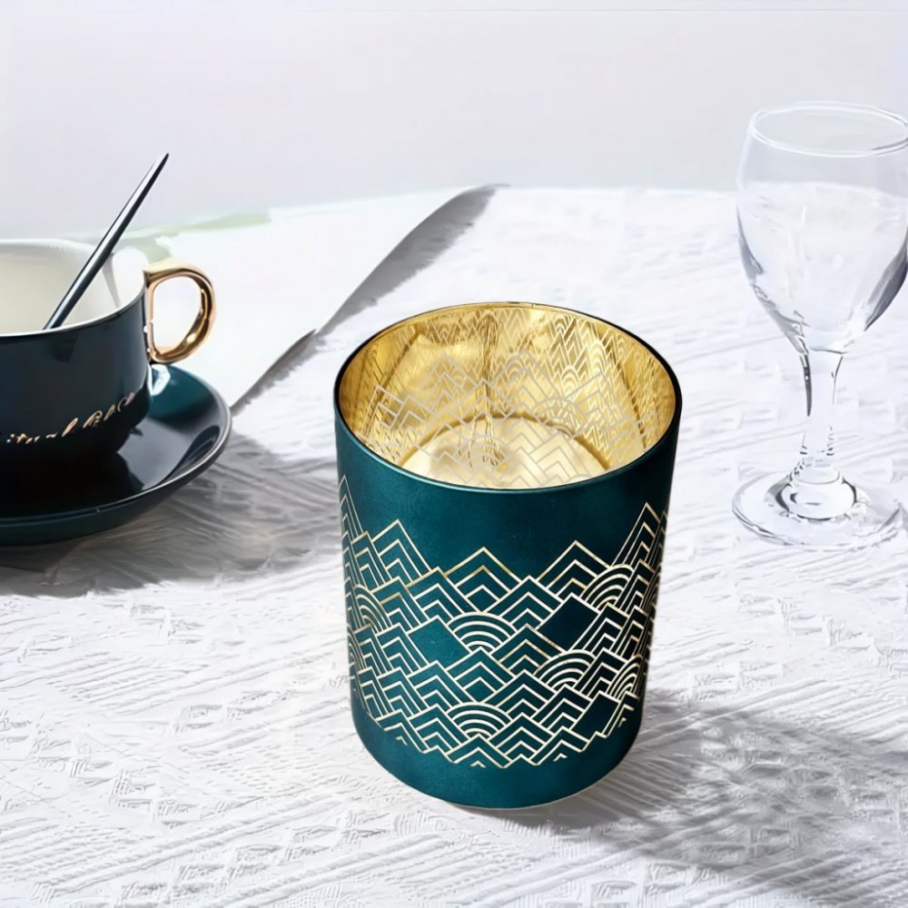 Skleněný svícen v zajímavé tyrkysové barvě s geometrickým vzorem přináší do interiéru moderní a sofistikovaný vzhled. Jeho minimalistický design v černé barvě doplňuje elegantní geometrický motiv, který vytváří zajímavé vizuální efekty při zapálení svíčky.