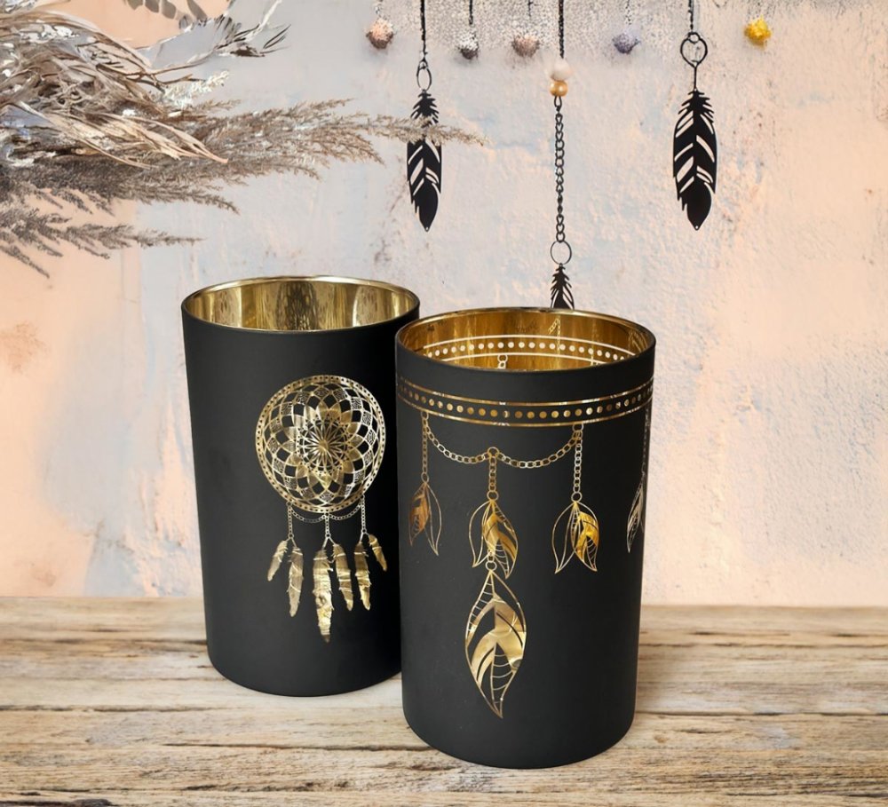 Skleněný svícen v černé barvě s motivem lapače snů je elegantním a mystickým doplňkem, který přináší do interiéru atmosféru klidu a pozitivní energie.