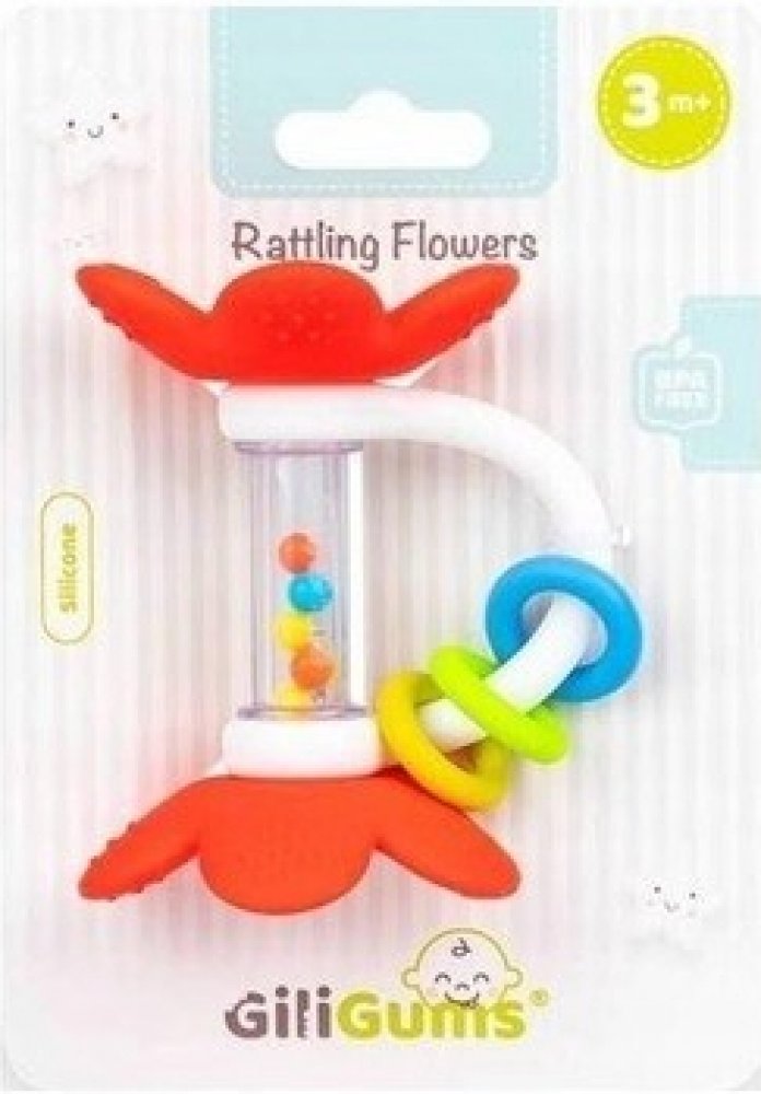 GiliGums - Silikonové kousátko, chrastítko Květina, červené - Okouzlující chrastítko, zdobené silikonovými květy z obou stran, je skvělým doplňkem pro každé miminko!