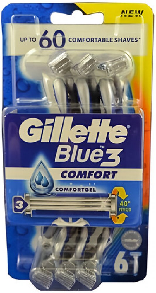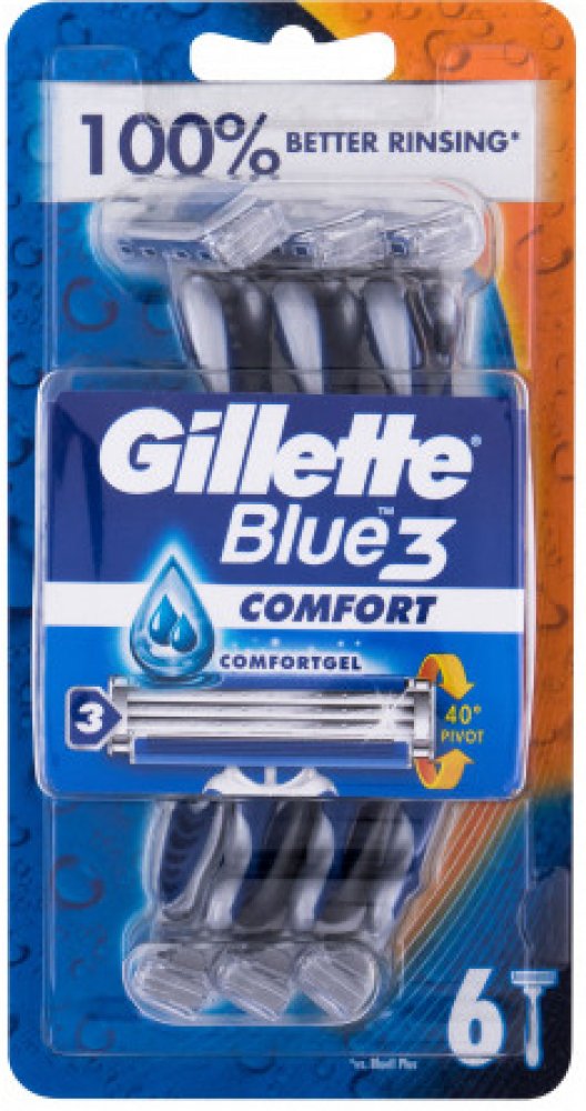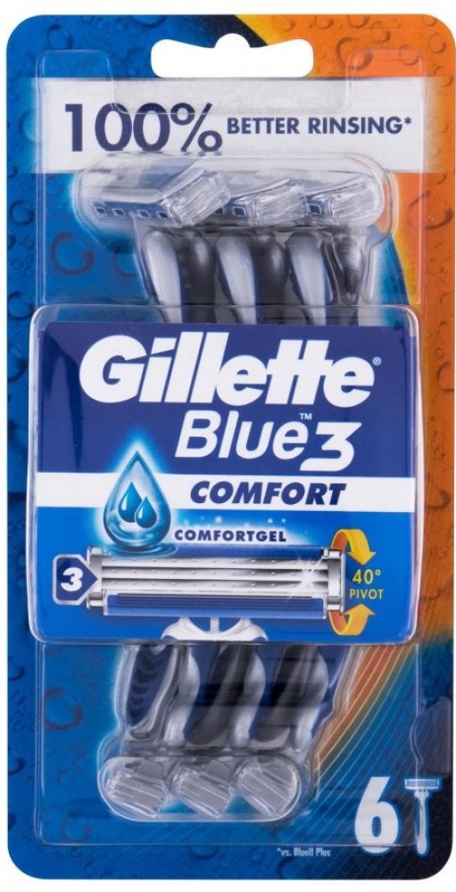 Jednorázová pánská holítka Gillette Blue3 Comfort díky výkyvné hlavě, která se dokáže vychýlit až o 40° a třem tenkým břitům umožňují opravdu dokonale hladké oholení. Jaké jsou výhody jednorázových holítek Gillette Blue3 Comfort? výkyvná hlava s 3 chromovanými břity, které jsou citlivé k pokožce, břity jdou velmi dobře opláchnout, takže nedochází k jejich zanášení, vylepšený zvlhčující pásek s technologií ComfortGel pro maximální komfort pokožky, rukojeť z protiskluzové pryže pro dokonalé držení.