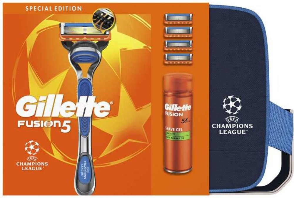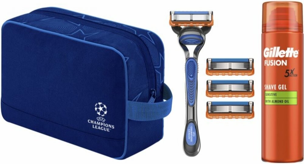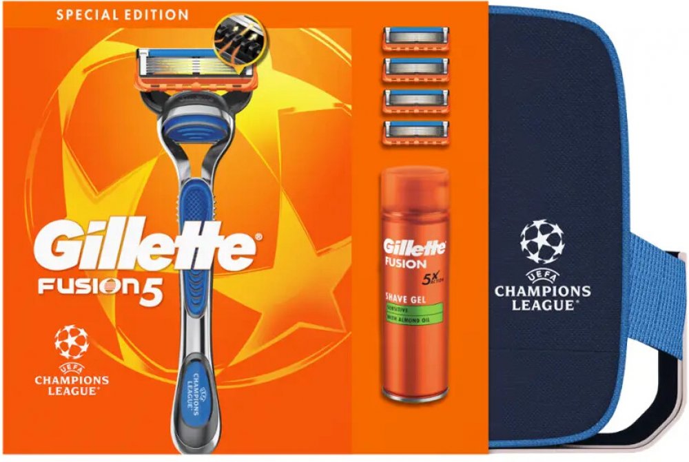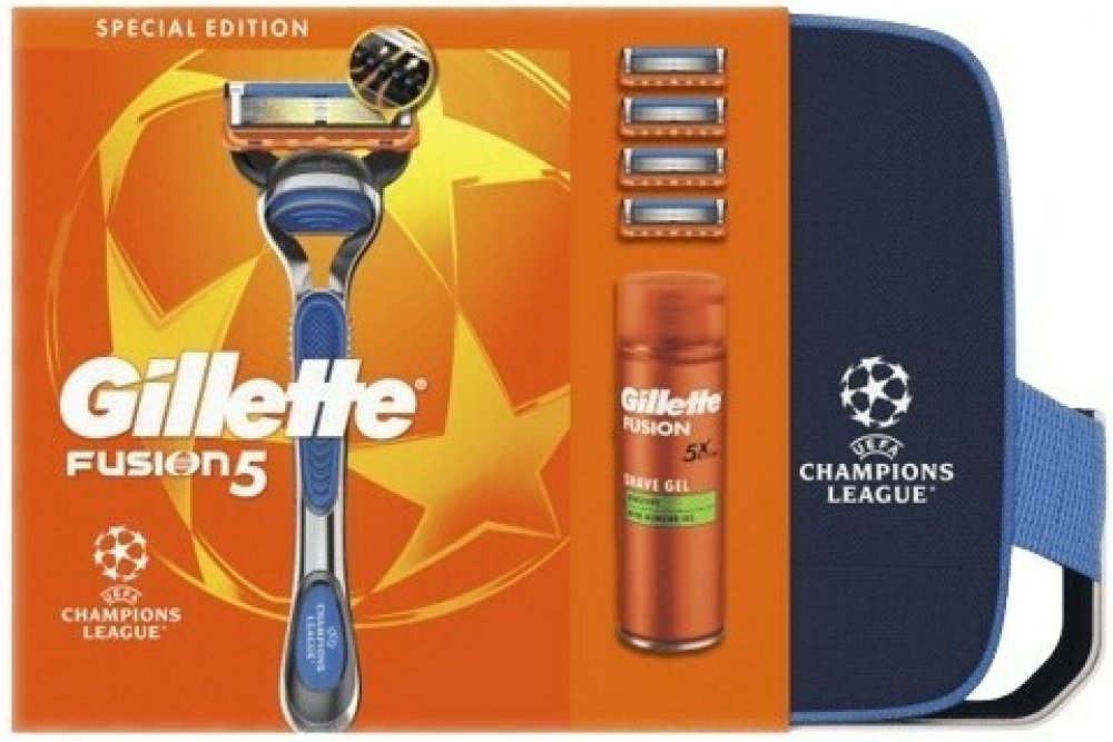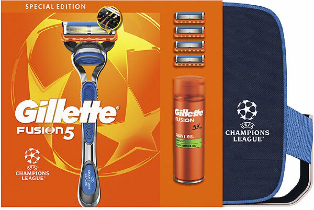 Gillette Fusion5 gel na holení 200 ml + Fusion5 Champions League holicí strojek 1 ks + Gillette Fusion5 náhradní břity 4 ks + kosmetická taška 1 ks
