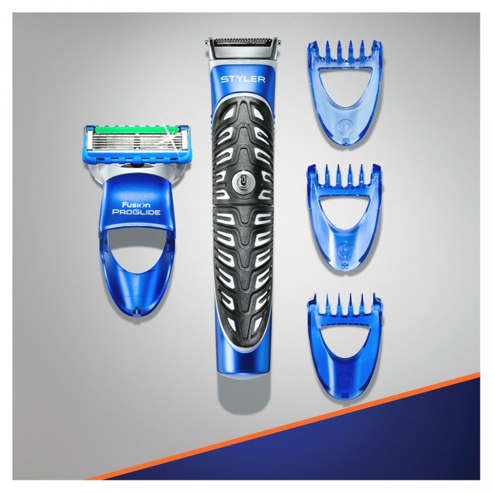 Gillette Fusion Proglide styler bateriový holicí strojek se zastřihovačem nabízí 3 funkce v jednom produktu díky třem zastřihovacím hřebínkům. Umožňuje zastřihování vousů, bezpečné a dokonalé oholení a tvarování přesných linií kolem vousů. Gillette Fusion Proglide styler bateriový holicí strojek je vhodný k oholení tváře i těla a můžete ho použít i ve sprše.