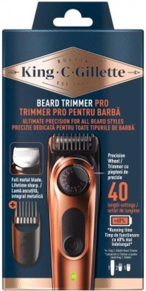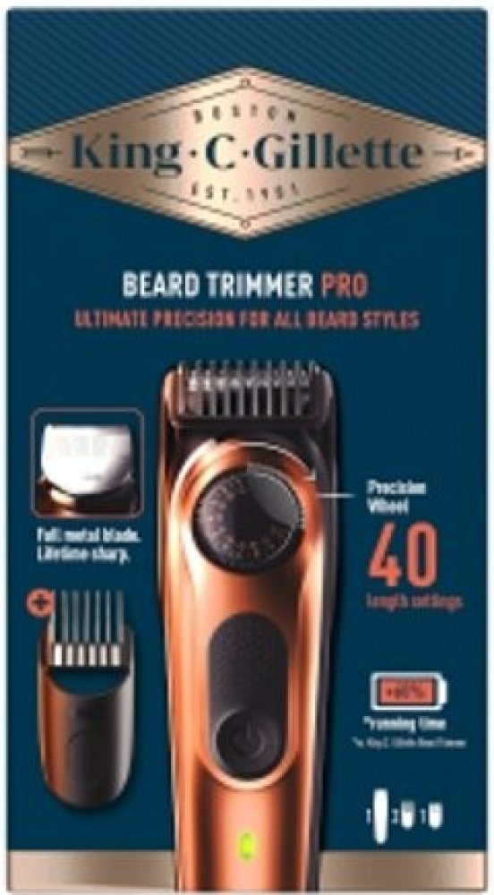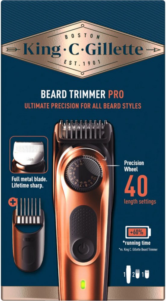 King C. Gillette zastřihovač vousů Beard Trimmer PRO s ovládacím kolečkem pro 40 délek je vybaven přesným ovládacím kolečkem se 40 možnostmi nastavení délky a 2 nástavci, takže si můžete upravit strniště nebo vousy přesně podle svých představ. Břity vydrží ostré po celý život. Zastřihovač vousů můžete na 1 nabití používat 80 minut bez jakékoliv ztráty výkonu. Po použití ho jednoduše umyjete pod tekoucí vodou. Ať už máte krátkou bradku nebo dlouhý plnovous, se zastřihovačem vousů Beard Trimmer od značky King C. Gillette budete mít tu nejlepší péči.