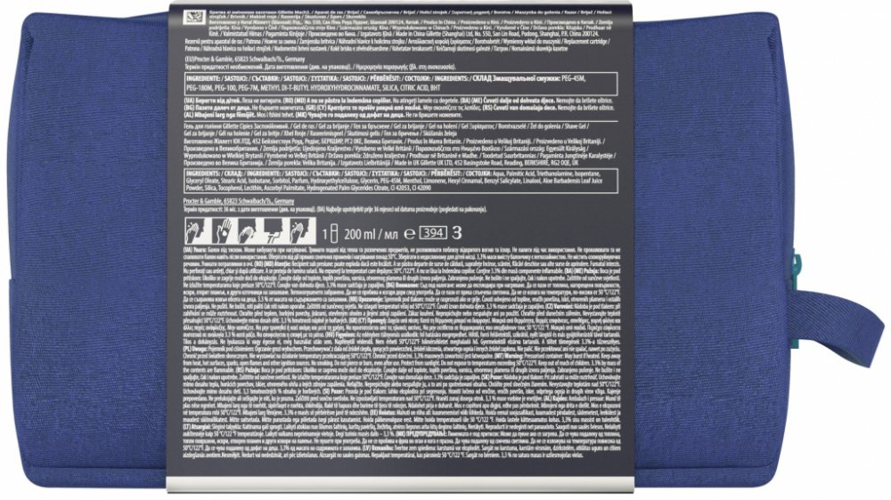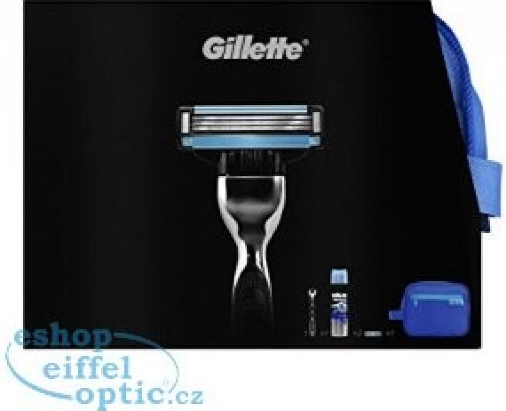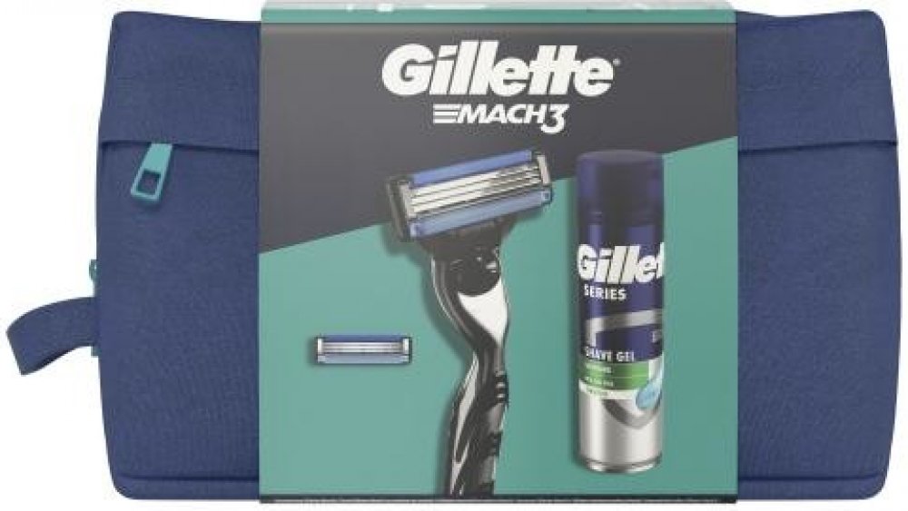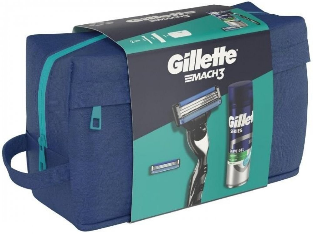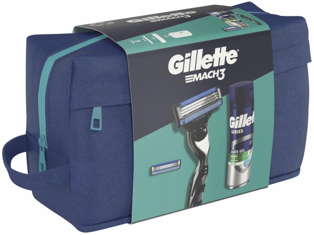 Balení obsahuje holicí strojek Gillette Mach3, 1 náhradní hlavici a gel na holení 200 ml v cestovní taštičce.