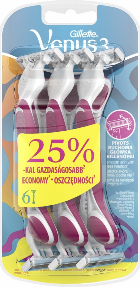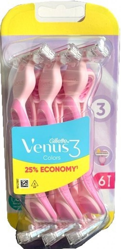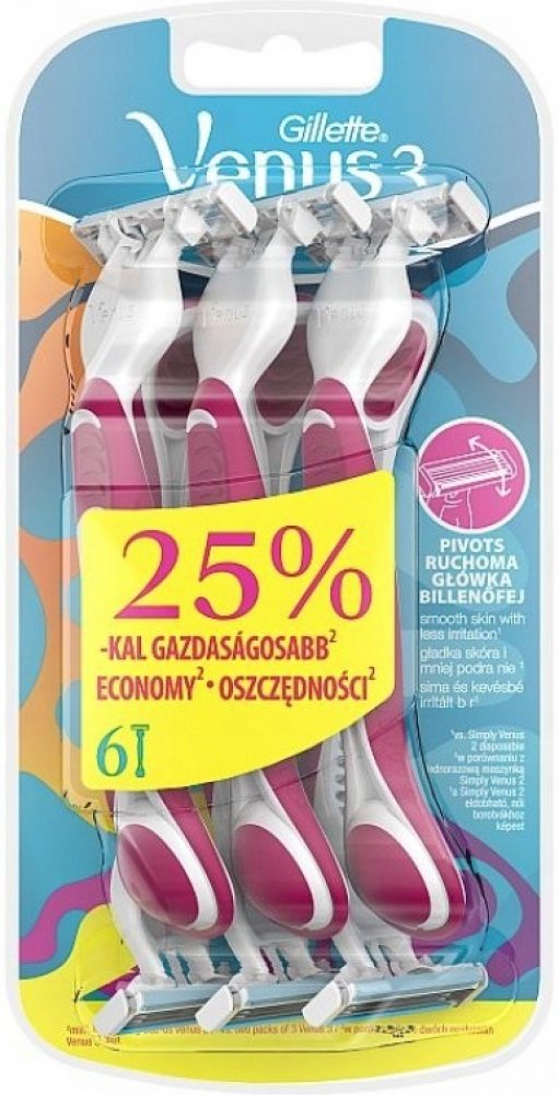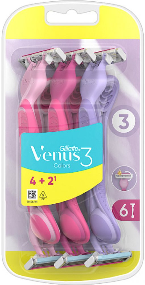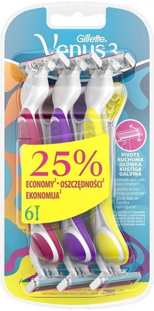 Dámská pohotová holítka Gillette Venus 3 Colors zajišťují hladké oholení za skvělou cenu. Tyto holicí strojky mají rukojeti ve více barvách. Díky nim bude holení zábava a pestrý zážitek. Mají výkyvnou holicí hlavici se 3 břity pro holení obtížně přístupných míst a zvlhčující pásek usnadňující skluz. Užijte si hladké holení s větším komfortem (v porovnání s holítky Venus Simply 2).