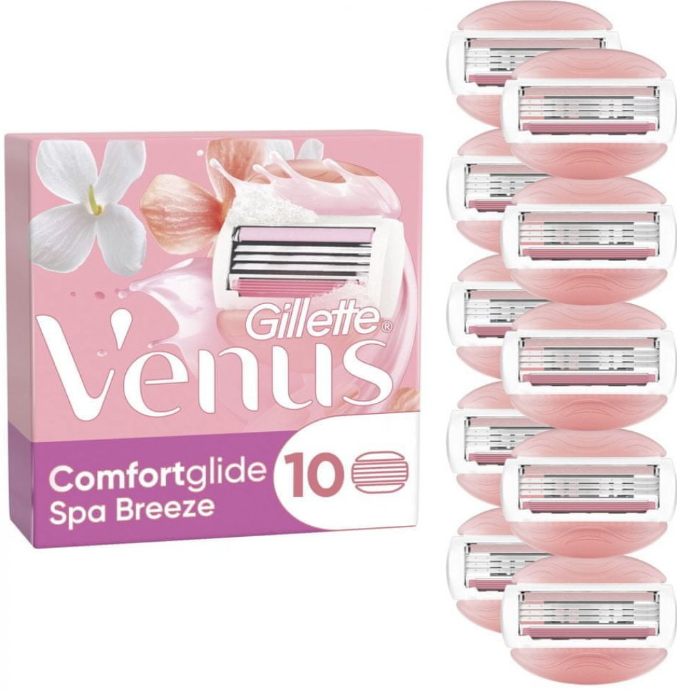 GILLETTE Venus ComfortGlide Spa Breeze 10 ks Užijte si dokonale hladké oholení. GILLETTE Venus ComfortGlide Spa Breeze přináší hlavice se třemi břity a integrovanými pásky gelu na holení. Hlavice se pružně přizpůsobí každé křivce a zajistí úžasně snadné oholení a to bez nutnosti využít gel na holení. Pásky s gelem obsahují pečující oleje a vaši pokožku provoní svěží vůní bílého čaje. Náhradní hla...