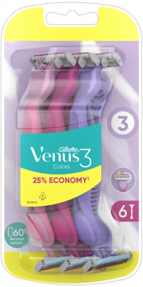 Dámská pohotová holítka Gillette Venus 3 Colors zajišťují hladké oholení za skvělou cenu. Tyto holicí strojky mají rukojeti ve více barvách. Díky nim bude holení zábava a pestrý zážitek. Mají výkyvnou holicí hlavici se 3 břity pro holení obtížně přístupných míst a zvlhčující pásek usnadňující skluz. Užijte si hladké holení s větším komfortem.Hladké a pohodlné holení: Pohotová holítka Venus 3 Colors nabízí v porovnání s Venus Simply 2 hladké oholení a méně pořezání a poškrábání pokožky 3 břity: Tento holicí strojek má 3 tenké a komfortní břity, které nevynechají prakticky žádné chloupky Úžasný komfort: Výkyvná holicí hlavice umožňuje holicímu strojku klouzat po pokožce Barvy: Rukojeti v různých barvách nabízejí zábavný a pestrý zážitek z holení Zvlhčující pásek usnadňující skluz: Zvlhčující pásek s obsahem vitaminu E usnadňuje skluz holicího strojku po pokožce Rukojeť s měkkým úchopem: Rukojeť tohoto holicího strojku má měkký úchop a je navržena tak, aby vám ve sprše nevyklouzla Z 60 % recyklovaný obal: Obal je vyroben z 60 % z recyklovaného materiálu Balení obsahuje: Jednorázová holítka 6 ks.Obecné nařízení o bezpečnosti výrobků [2023/988] (EU GPSR):Výrobce: Procter & Gamble65823 Schwalbach/Ts., Germanywww.pg.com