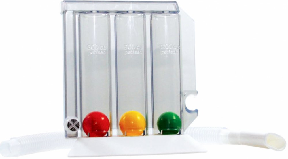 Dechový trenažér pro respirační cvičení je rehabilitační pomůcka určená pro domácí terapii při dýchacích potížích, především po prodělání onemocnění COVID-19, po operacích v oblasti hrudníku nebo břicha. Trenažér se skládá ze základny, 3 různobarevných kuliček, střední části, tuby a náustku.