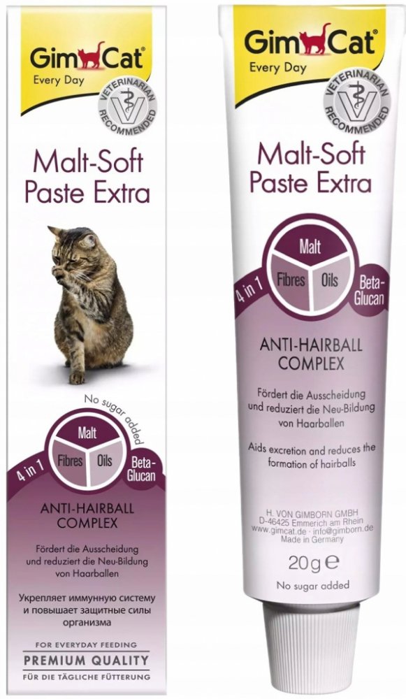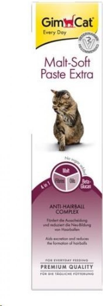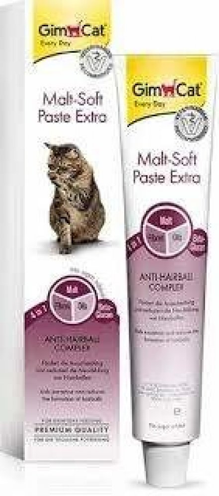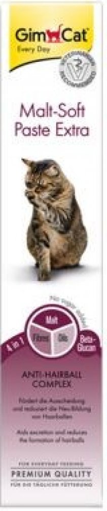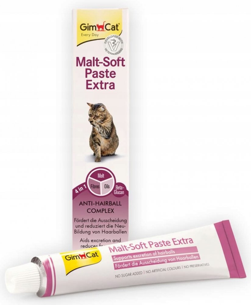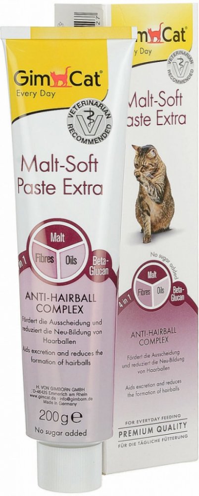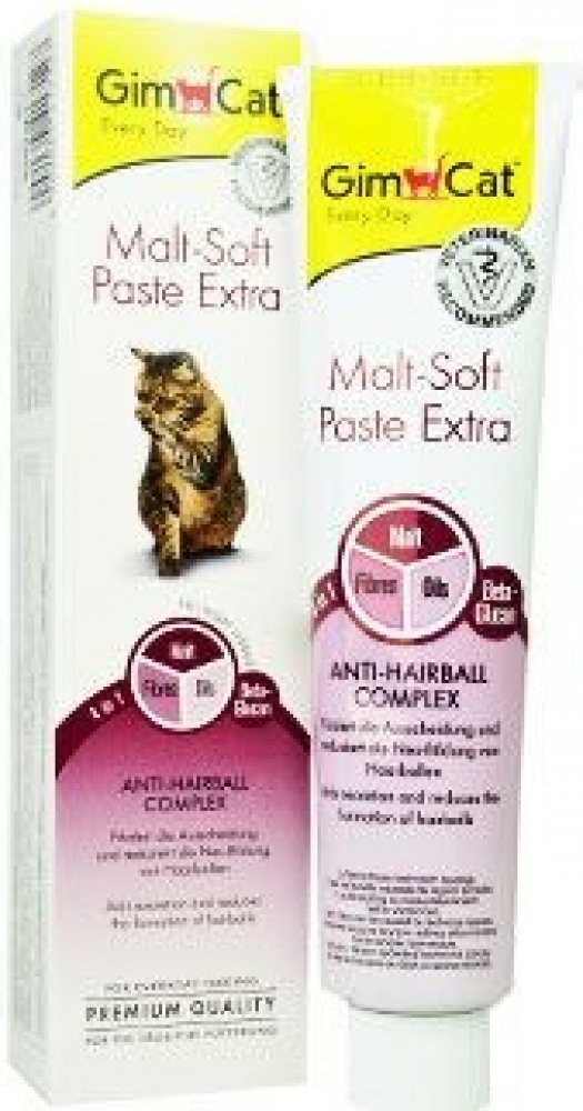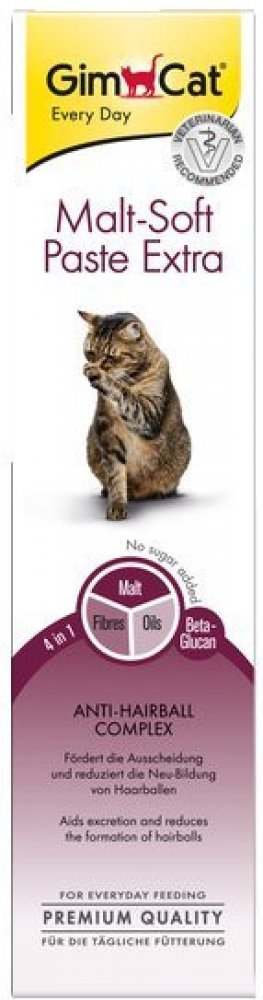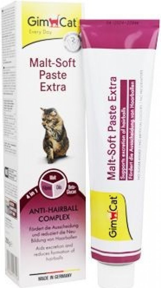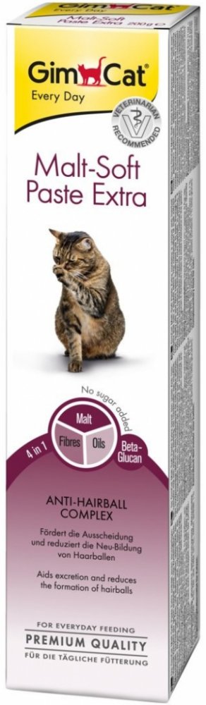 Pasta GimCat Malt-Soft Extra obsahuje jedinečný Anti-Hairball Komplex, který působí hned dvojnásobně. Kombinace výtažku sladu, kvalitních olejů a balastních látek podporuje přirozené vylučování spolykaných chlupů a pomáhá omezovat tvorbu chomáčů. Kromě toho pomáhá předcházet trávícím problémům v souvislosti s tvorbou chomáčů chlupů a betaglukan pomáhá předcházet zánětům v trávící soustavě.