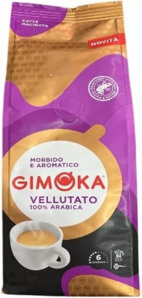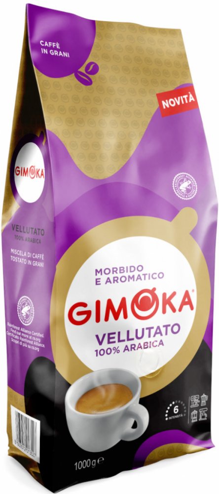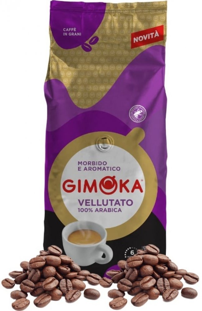Gimoka Vellutato - směs zrn Arabica certifikovaná Rainforestem. Jemná, s vůní květin a sušeného ovoce.