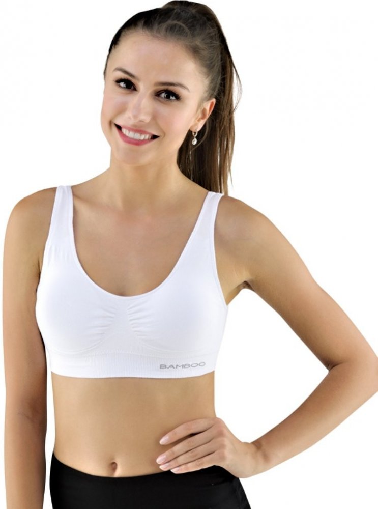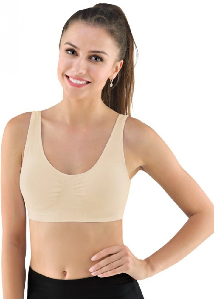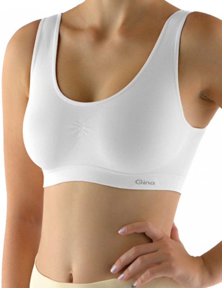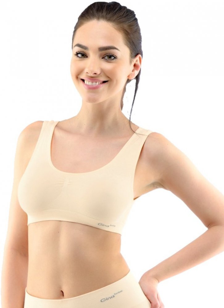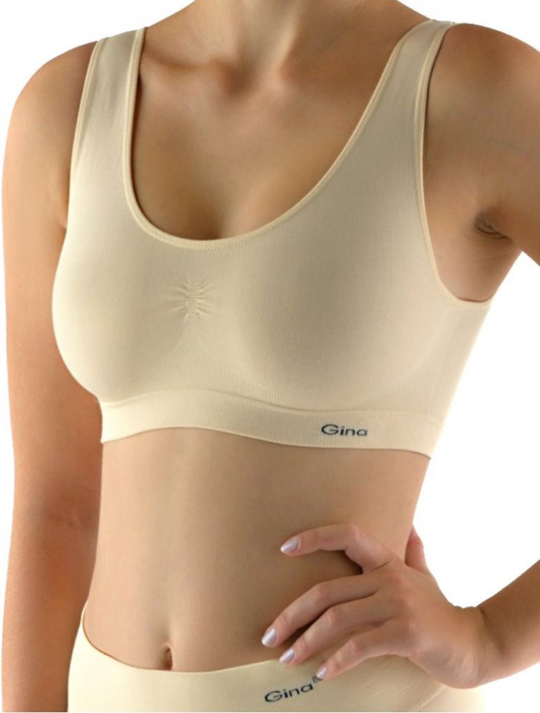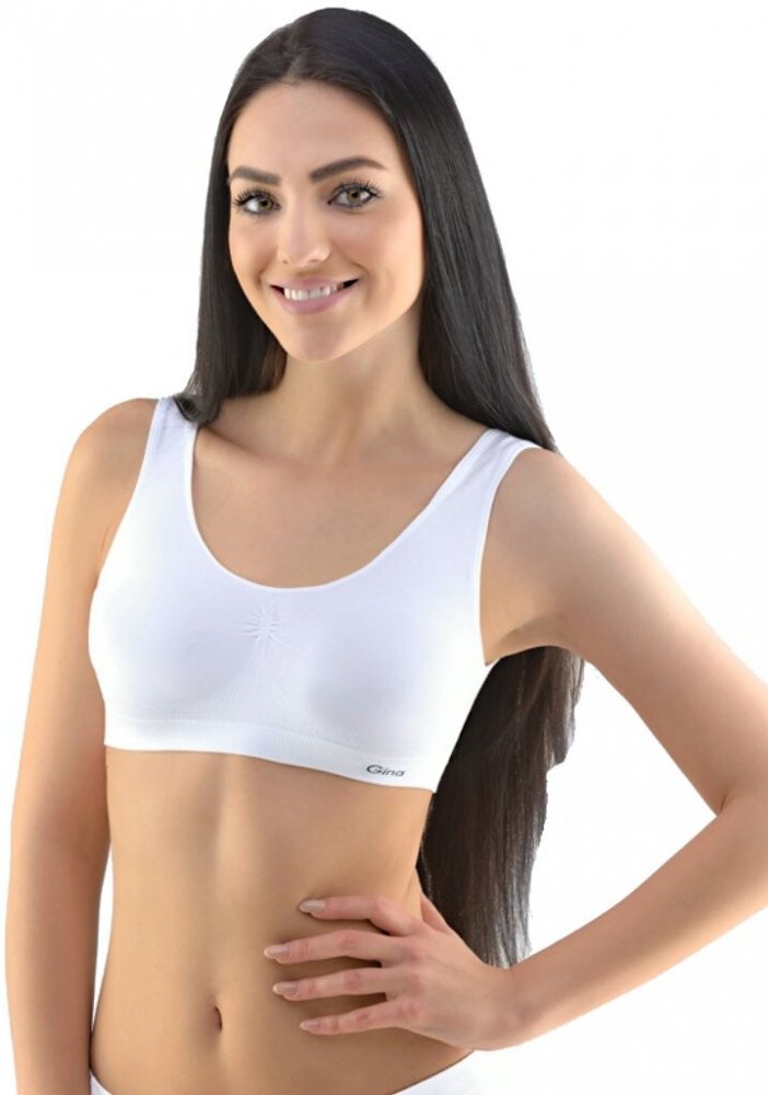 Podprsenkový top se širšími ramínky, dámské bezešvé prádlo. Dolní kraj je zesílený a zapravený bezešvým způsobem.