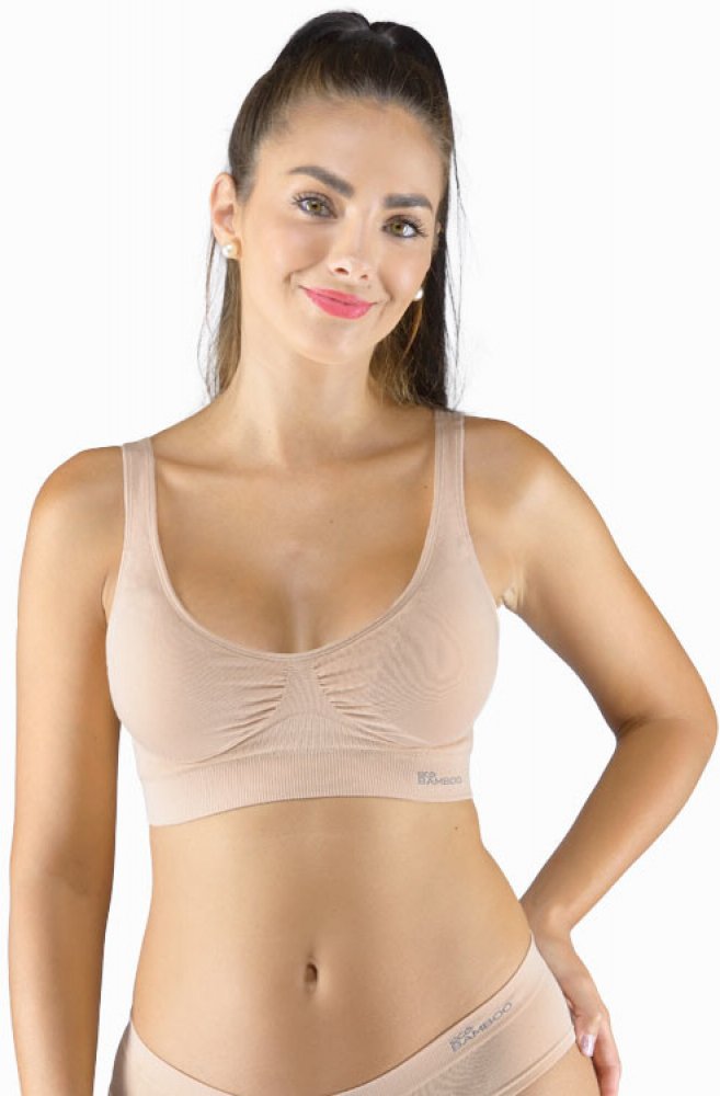 Složení: 80% Viskóza ( Bambus ) 16% Polyamid 4% ElastanPodprsenka bez kostic s vyjímatelnými vycpávkami, dámské bezešvé sportovní prádlo. Dolní kraj je zesílený a zapravený bezešvým způsobem. V průramcích a průkrčníku je zašitá úzká pruženka. Přední díl je dvojitý a mezi vnější a vnitřní část jsou vloženy lisované košíčky. Zadní díl je v celku. Podprsenka je jednobarevná. V záložce je vypletené logo.Materiál je vyroben z bambusového vlákna, které je doplněno elastanem. Úplet je velmi jemný a příjemný na nošení. Do každodenního prádla přináší luxusní hedvábný vzhled.Luxusní kolekce bezešvého prádla ECO Bamboo má nejvyšší podíl bambusového vlákna. V této kolekci jsme se zaměřili na ekologické zpracování jak samotného vlákna, tak postupů při barvení a konečné úpravě textilie. Prádlo je baleno v ekologických sáčcích a doplněno krabičkou bez laminace.. Kolekce: Eco Bamboo.
