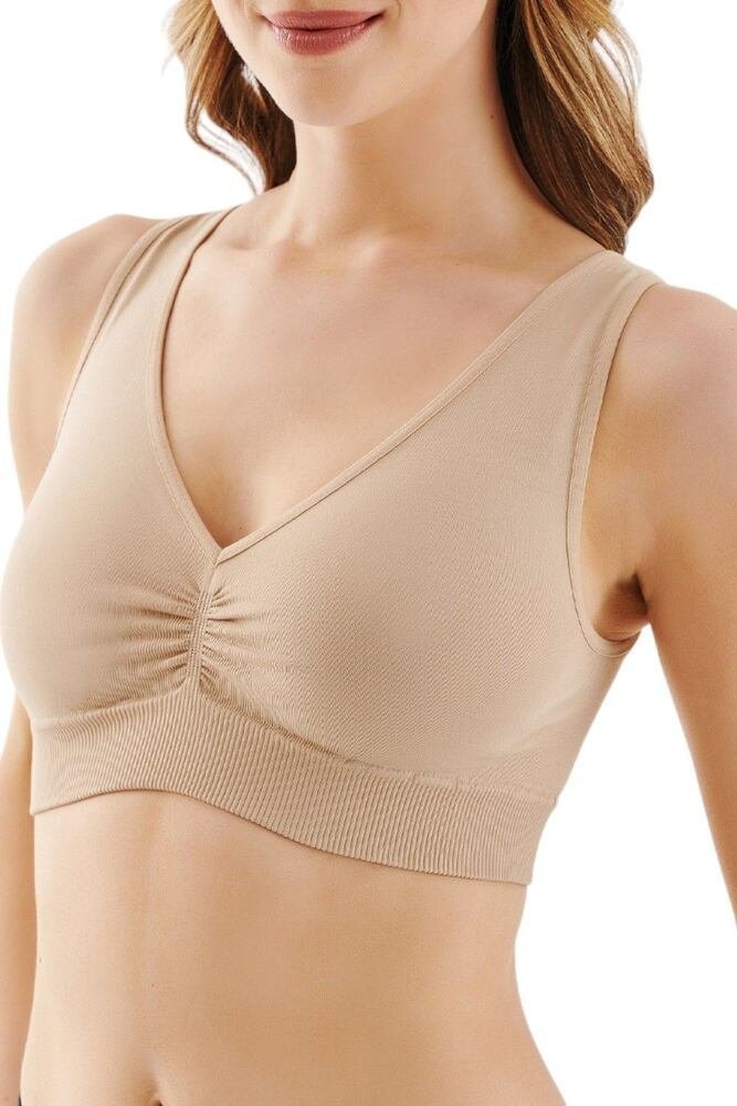 podprsenka sportovní s vycpávkami, bez kostice, bezešvé, jednobarevné značky GINA, kód 07014. Barva: béžová , Velikost: S/M,
