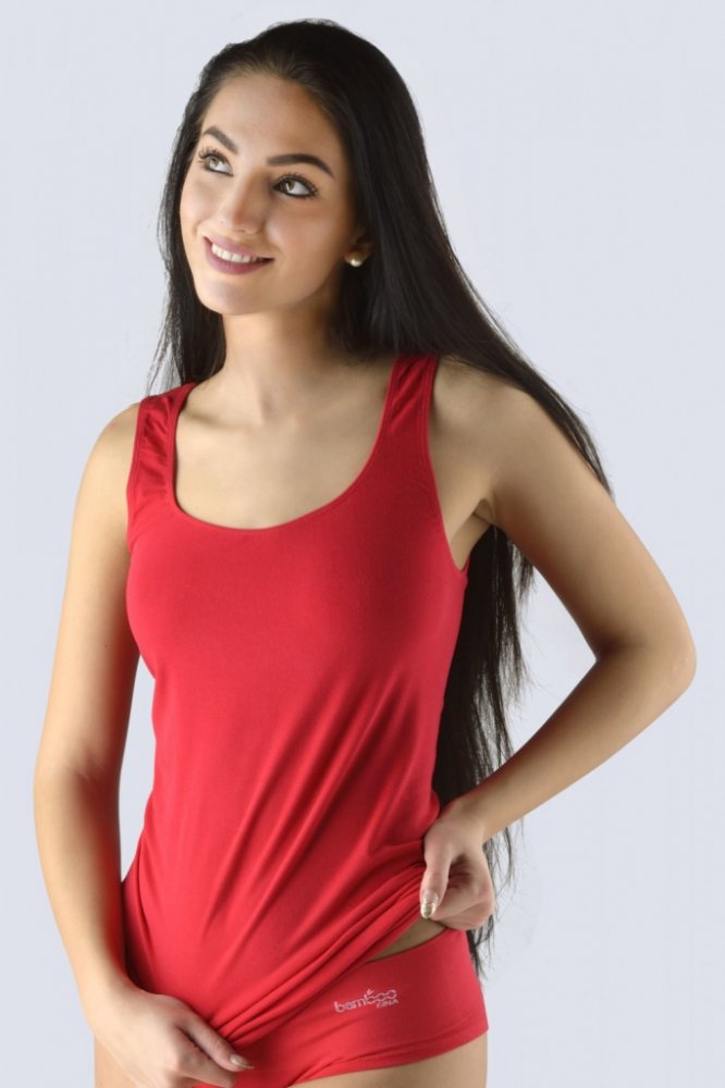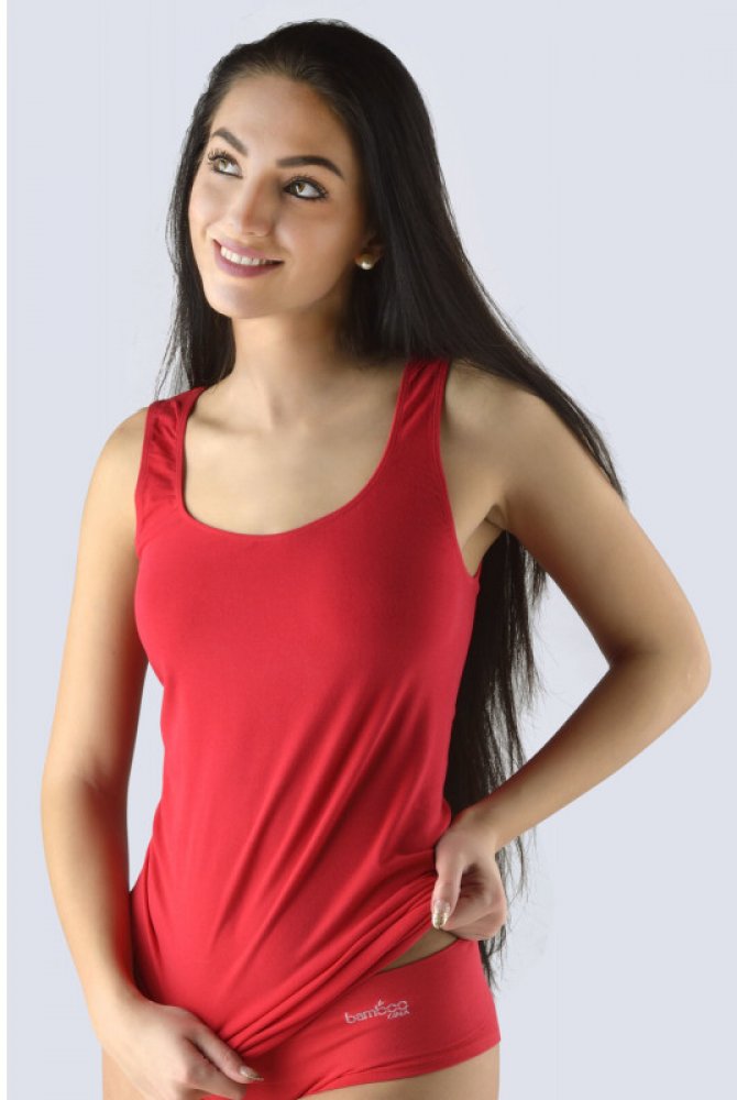 Tílko se širšími ramínky, dámské bezešvé prádlo. Dolní kraj je zapravený bezešvým způsobem. V průramcích a průkrčníku je zašitá úzká pruženka. Ramínka se na předním díle mírně zužují, čímž se vytváří pěkně tvarovaný dekolt. Tílko je jednobarevné. Je bez loga. Tílko je v prodloužené délce.Materiál je vyroben z bambusového vlákna, které je doplněno bavlnou a elastanem. Úplet je velmi jemný a příjemn...