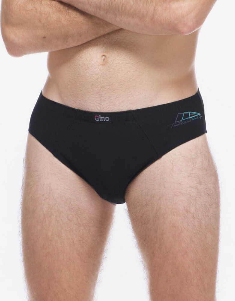slipy s úzkým bokem, úzký bok, šité, s potiskem značky GINA, kód 70073. Barva: černá tyrkysová, Velikost: 50/52,