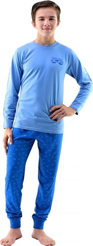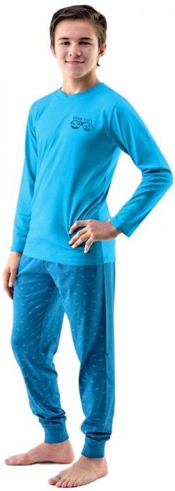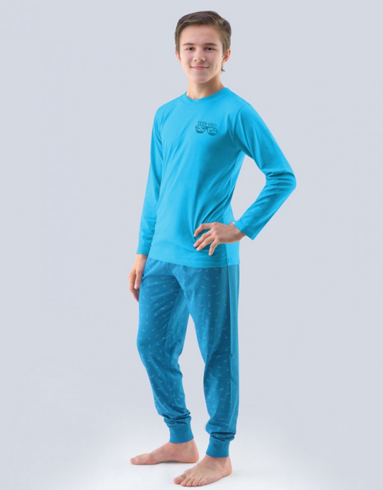 Triko s dlouhým rukávem a dlouhé kalhoty, chlapecké šité pyžamo. Kalhoty jsou potištěné a všité do manžet. Triko je jednobarevné s malým solitérem. Materiál je vyroben ze 100% bavlny. Úplet je vhodný pro všechny, kteří hledají přírodní materiály. Prádlo z tohoto materiálu je vhodné pro každodenní nošení. Materiál: 100% bavlna