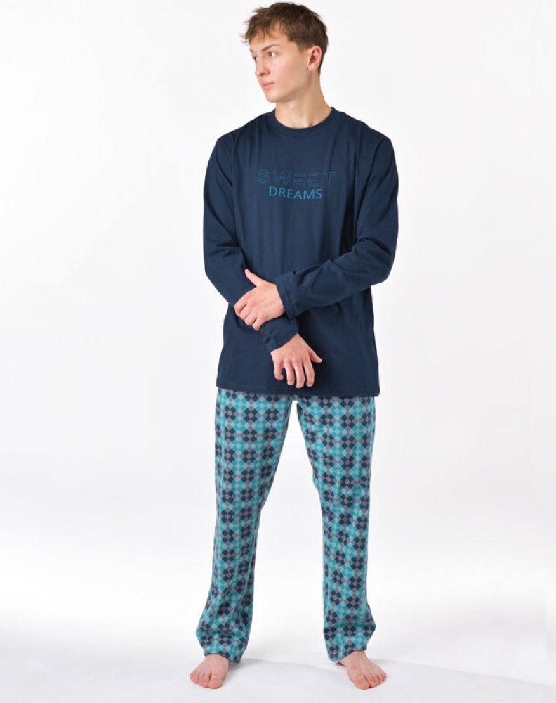 Pyžamo dlouhé pánské, šité, s potiskem, kód 79205. Složení: 100% BavlnaPánské klasické pyžamo volného střihu z jemného úpletu Vám poskytne pohodlí během spánku. Kalhoty s výraznějším vzorem doplňuje triko s dlouhými rukávy a potiskem na hrudi.