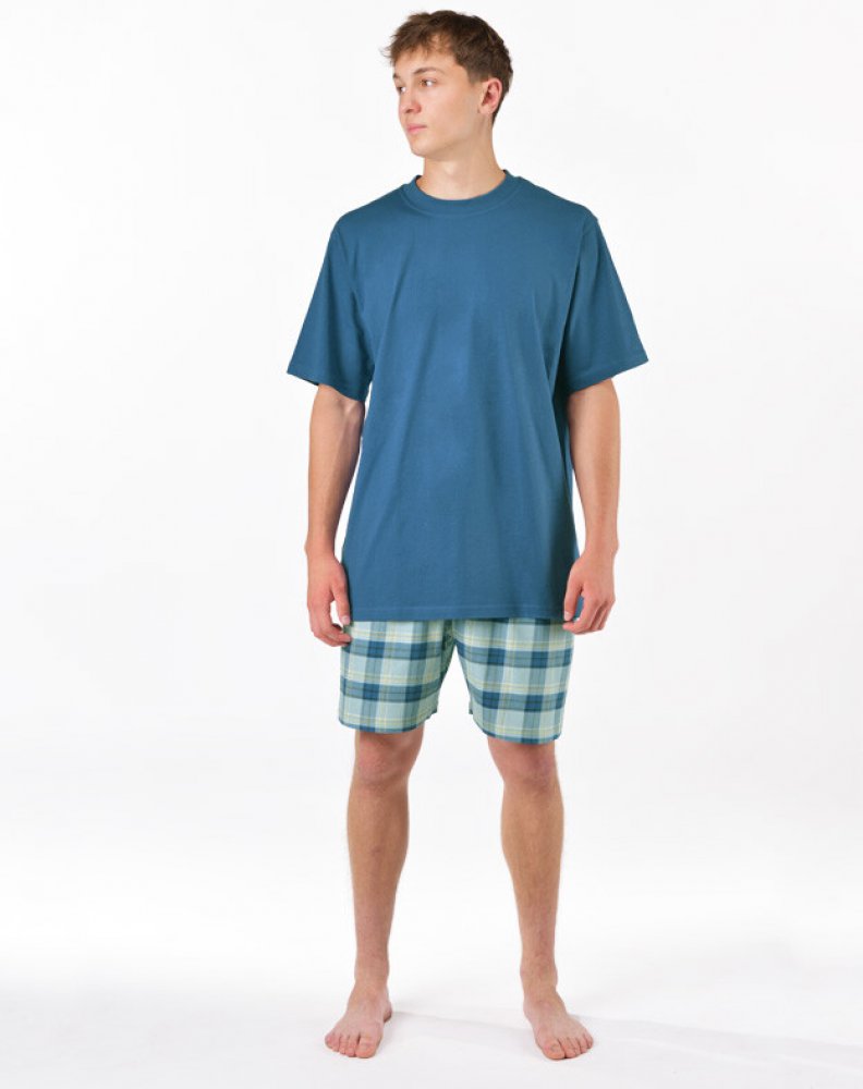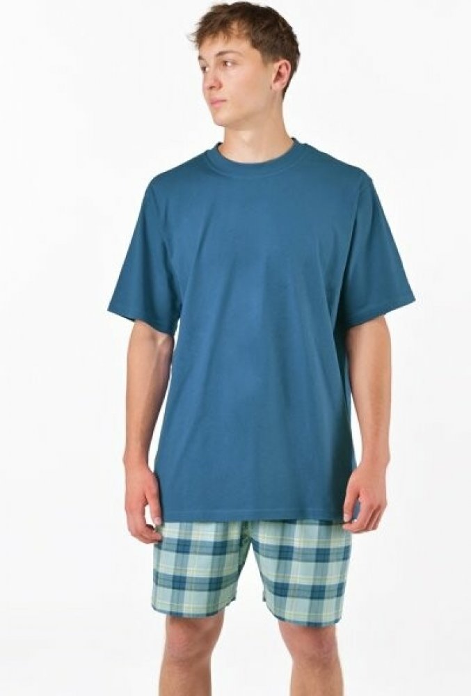 100% BavlnaPánské pyžamo volného střihu z jemného úpletu Vám poskytne pohodlí během spánku. Krátké kalhoty s oblíbeným potiskem káro doplňuje jednobarevné triko s krátkými rukávy