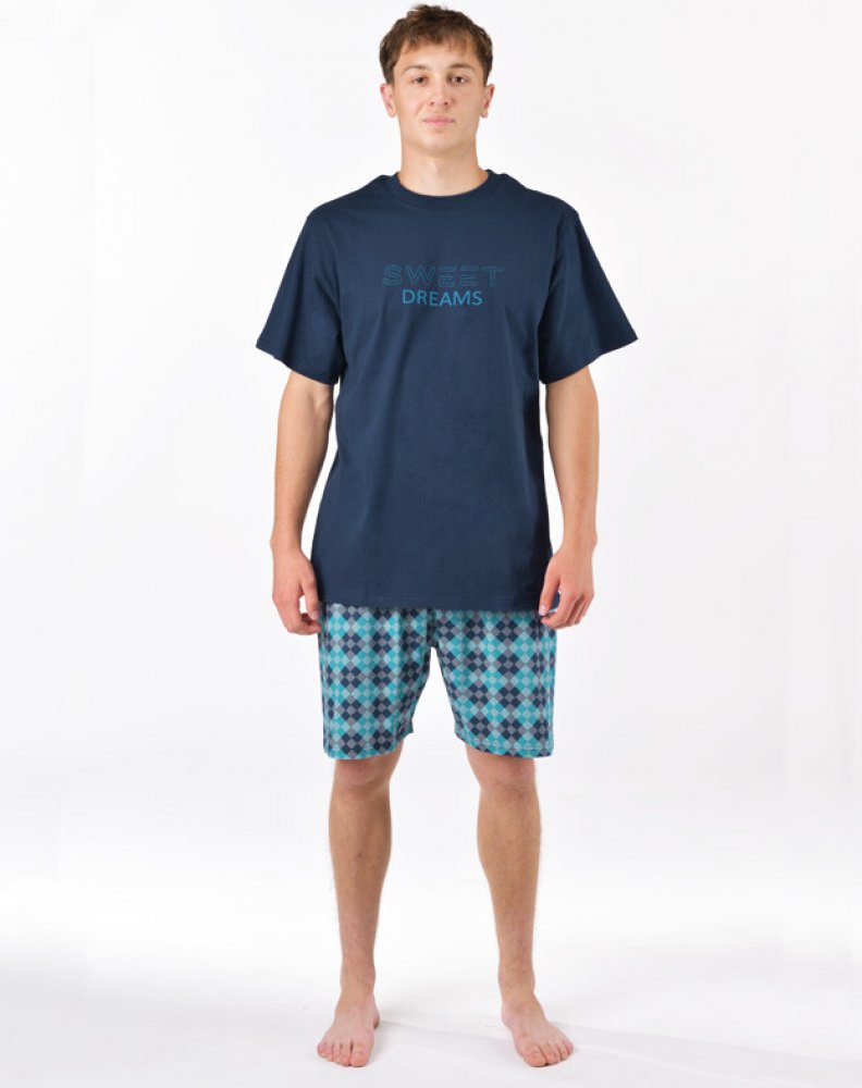 Pánské pyžamo volného střihu z jemného úpletu vám poskytne pohodlí během spánku. Krátké kalhoty s potiskem doplňuje triko s větším potiskem na hrudi a krátkými rukávy.