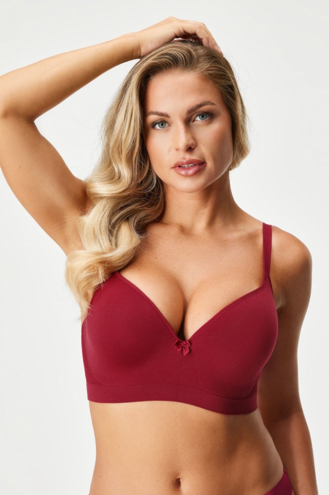 Podprsenka s kosticemi a lisovanými košíčky, dámské bezešvé prádlo. Vnější část podprsenky je z polyamidového materiálu, košíčky jsou z polyuretanové pěny, která je uvnitř potažena bavlněným materiálem. Ramínka jsou nastavitelná. Podprsenka je jednobarevná. Zapínání je třířadé na 2 háčky. Na předním díle je mašlička. Podprsenka je vhodná pro každodenní běžné nošení. Elastan přidává materiálu pružnost a zlepšuje jeho tvarovou stálost. Materiál se vyznačuje velmi dobrou odolností a trvanlivostí barev.
