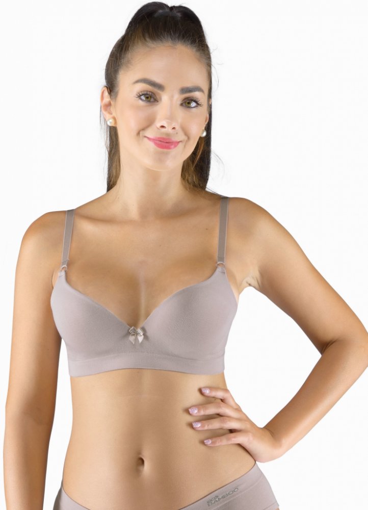 Podprsenka s kosticemi a lisovanými košíčky, dámské bezešvé prádlo. Vnější část podprsenky je z bambusového materiálu, košíčky jsou z polyuretanové pěny, která je uvnitř potažena bavlněným materiálem. Okraje košíčků jsou hladké bez lemovek. Ramínka jsou nastavitelná. Podprsenka je jednobarevná. Zapínání je třířadé na 2 háčky. Na předním díle je mašlička. Podprsenka je vhodná pro každodenní běžné nošení.