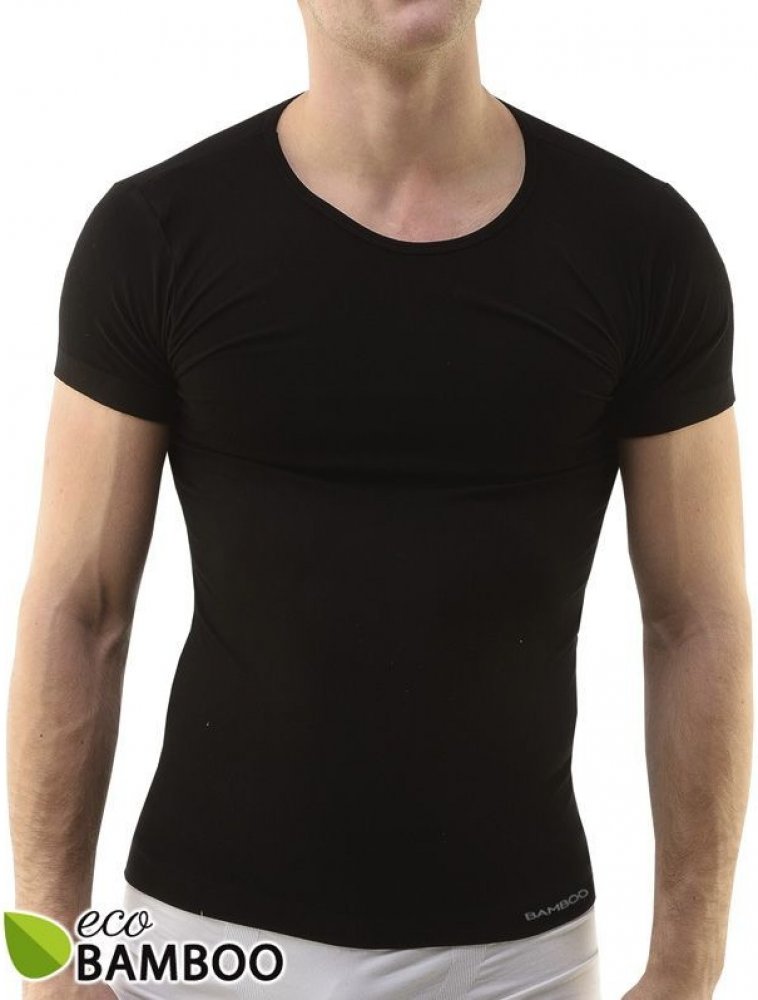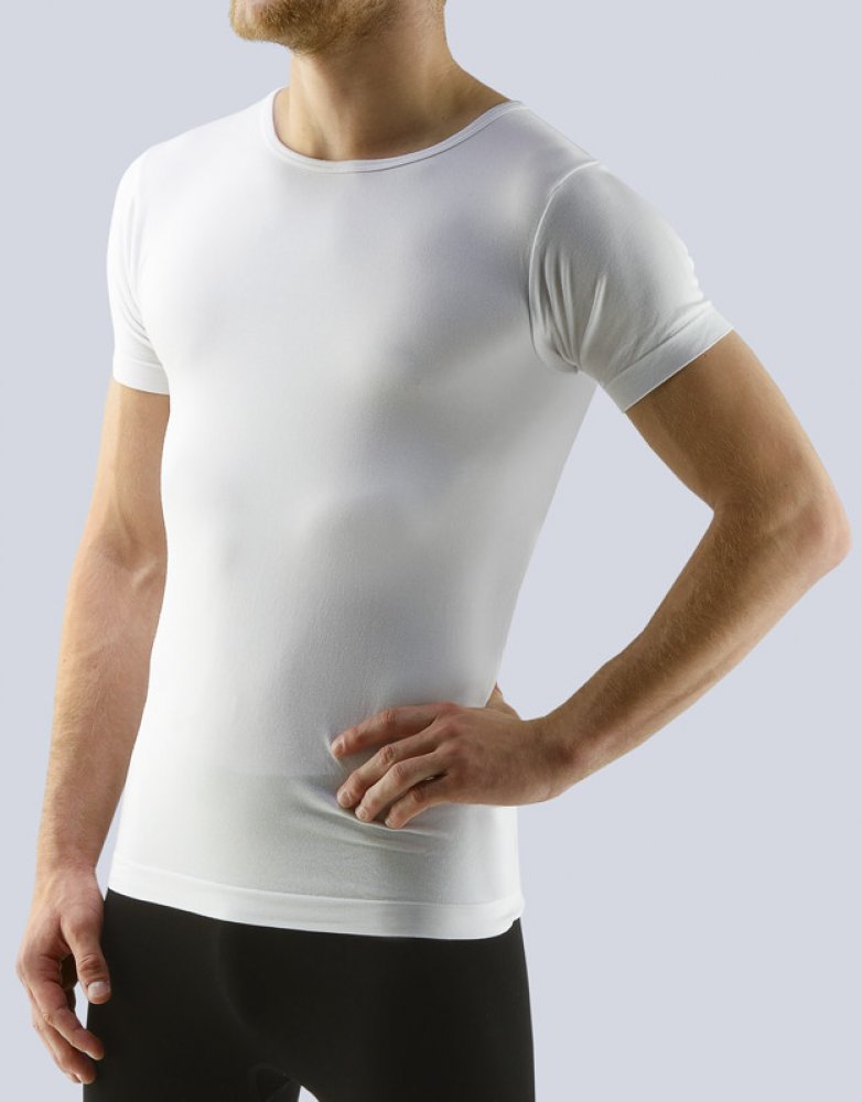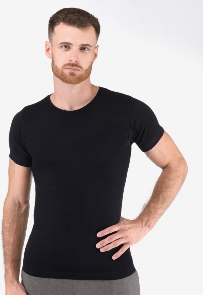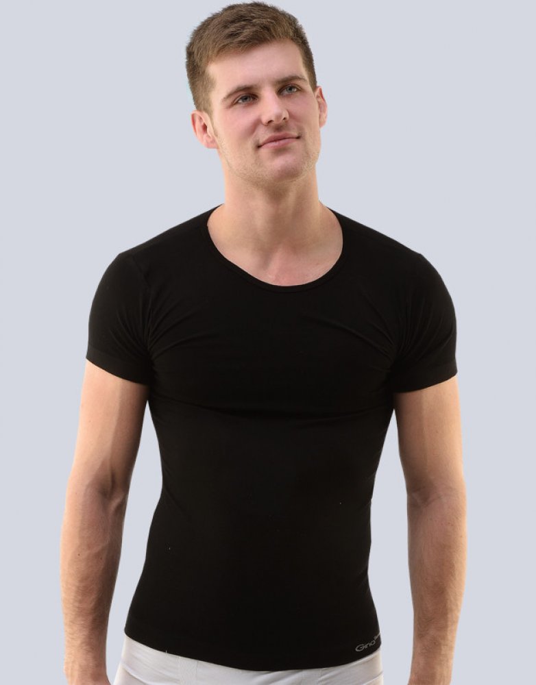 Tričko s krátkým rukávem, pánské bezešvé prádlo. Dolní kraj je zapravený bezešvým způsobem. Průkrčník je začištěný lemovacím proužkem. Tričko je jednobarevné. Je bez loga.