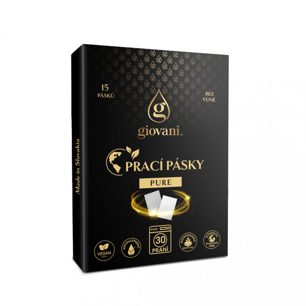 Objevte moderní alternativu k běžným pracím prostředkům. Existuje mnoho důvodů, proč byste měli používat prací pásky Giovani®. Přečtěte si o nich níže. Tento typ pracích pásků PURE neobsahuje přidané parfémy, a tak plně vynikne intenzita našich pracích parfémů bez jakékoli interakce s jejich vůní. Použijte prací pásek pro čistotu svého prádla a přidejte parfém na praní jako náhradu aviváže pro dokonale voňavé prádlo.